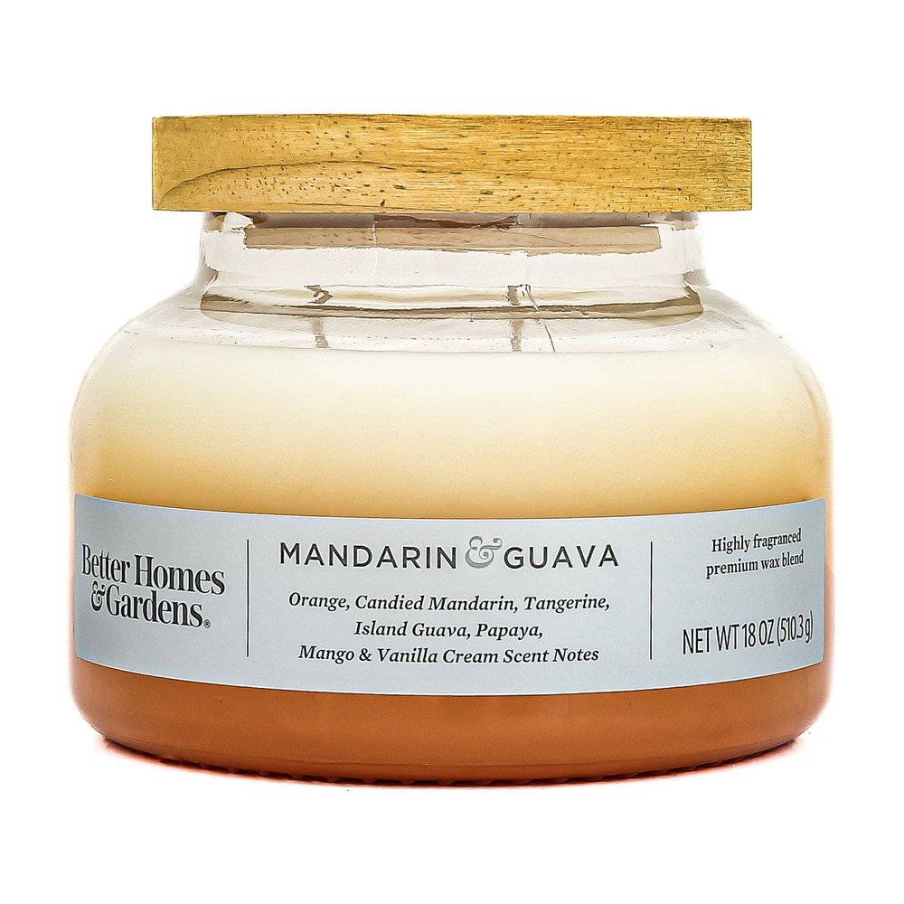 Product details This 18oz 2-Wick ombre jar glass candle with a wooden lid from Better Homes & Gardens is filled with a specially crafted soy wax that is poured to create a consistent and pleasant burn experience. The candle gives off a warm, golden light that lasts up to 40 hours and fills the room with an indulgent fragrance. With scent notes of sugar-dusted orange, candied mandarin, and effervescent tangerine that sparkle with sun-ripened island guava and luscious papaya fruit swirled with nectarous mango and irresistible vanilla cream. The contemporary ombre printed glass design is wonderful to use in a variety of settings and is sure to match and complement your existing décor. Scent Notes: Orange, Candied Mandarin, tangerine, Island Guava, Papaya, Mango & Vanilla Cream 18oz of fragranced premium soy wax blend Ombre colored jar 2 wicks