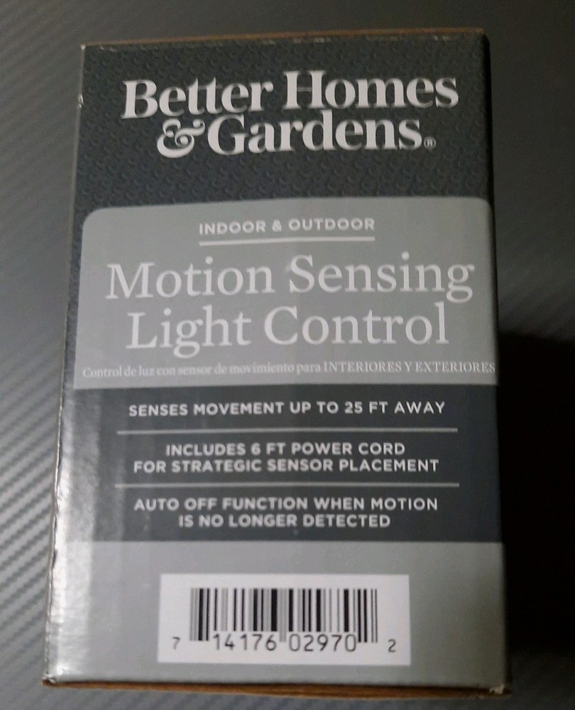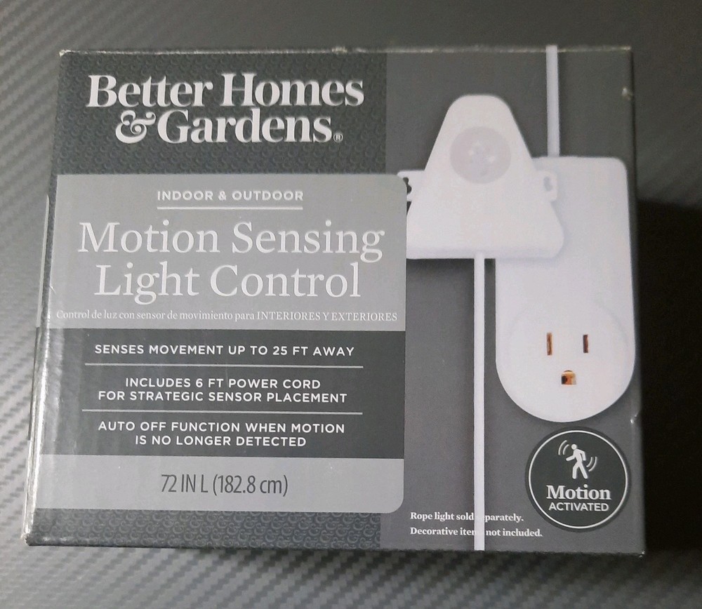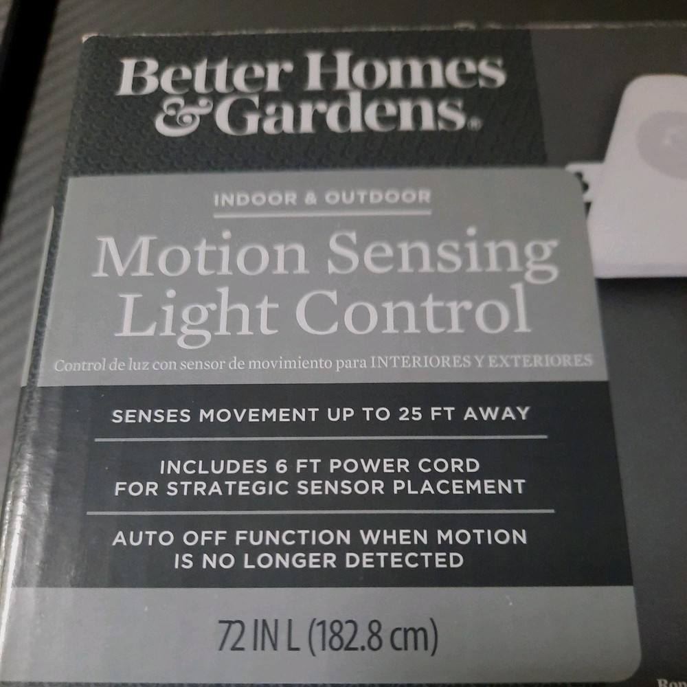 The Better Homes & Gardens Motion Sensing Light Control is a versatile and efficient lighting solution for indoor and outdoor areas. With its light sensor and corded electric power source, this product senses movement up to 25 ft away, providing added security and illumination. Whether used in a yard, garden, or outdoor living space, this light control offers convenience and peace of mind. Better Homes & Gardens Motion Sensing Light Control NEW indoor / outdoor