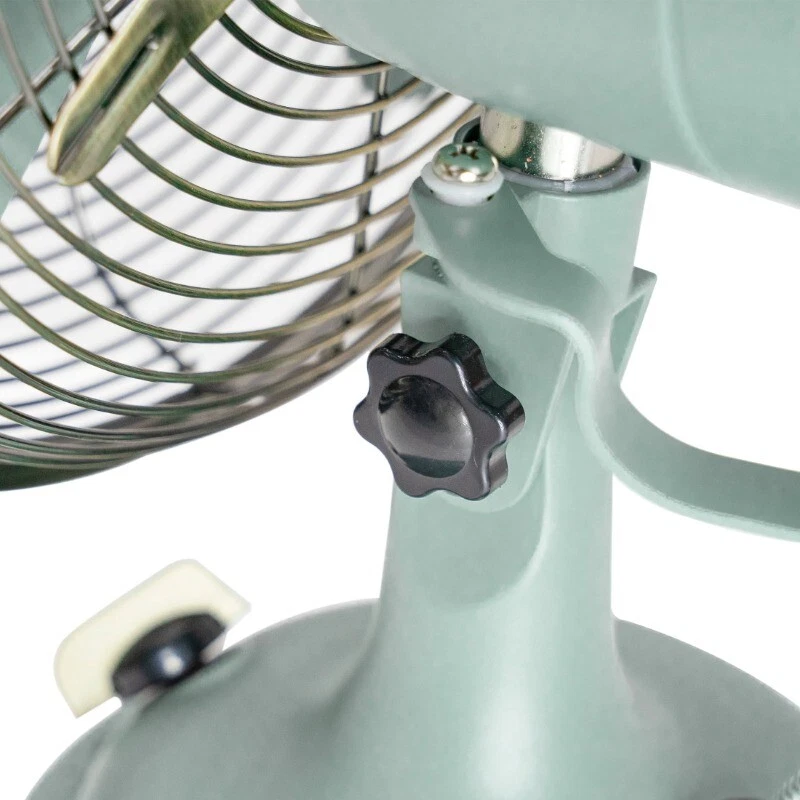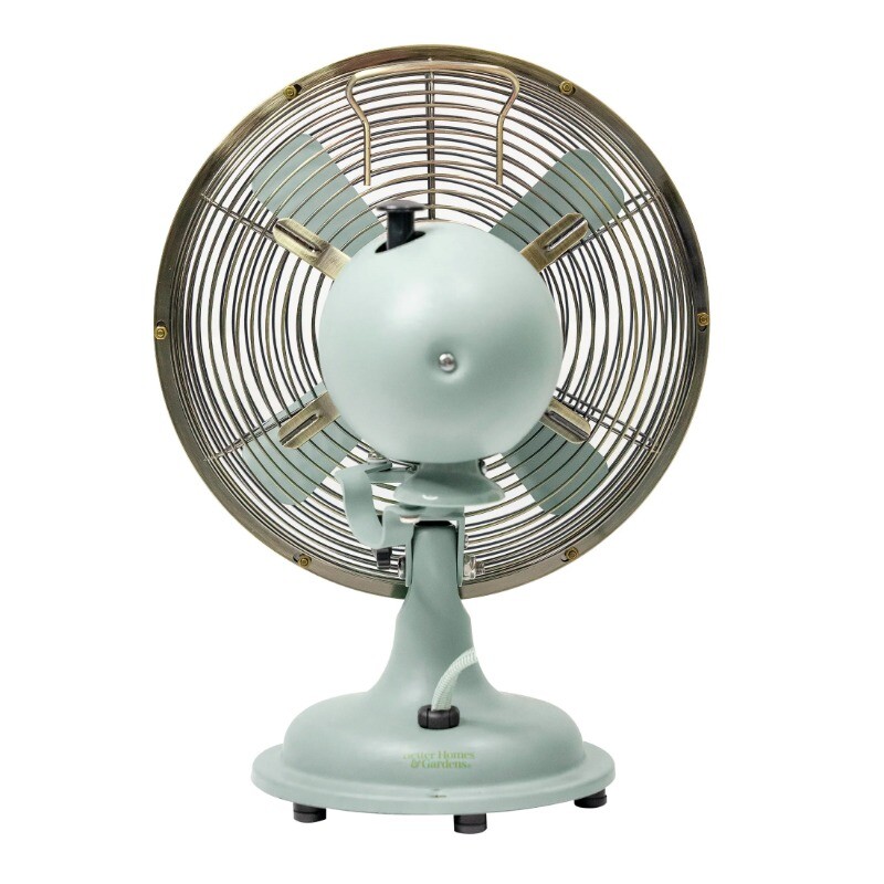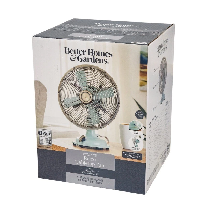 Maintain the perfect comfort level in almost any room with the Better Homes & Gardens new 8" retro 3-speed metal table fan. Designed for taking up a small footprint on desks, tabletops, shelves, and other spaces, this vintage-looking fan features your choice of three speeds, oscillation, and a tilting head to provide the perfect angle of air circulation. The Better Homes & Gardens 8" retro 3-speed metal table fan is perfect for large rooms and small including bedrooms, dining rooms, living rooms, dens, playrooms, man caves, offices, classrooms, dorm rooms, and more. Better Homes & Gardens 12" retro 3-speed metal table fans and Better Homes & Gardens 16'' retro 3-speed metal standing fans are also available. Retro-styled, vintage looking table fan Durable metal construction for a long life Offers three different speed settings and oscillation to keep air moving through rooms