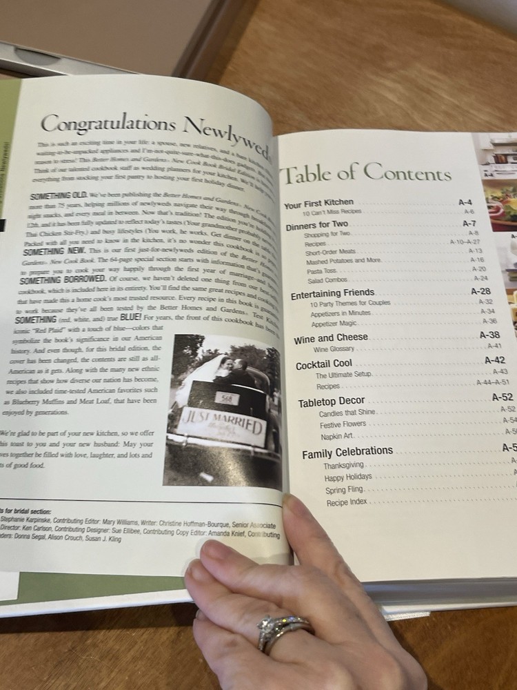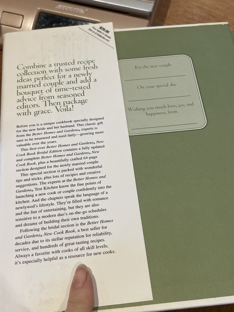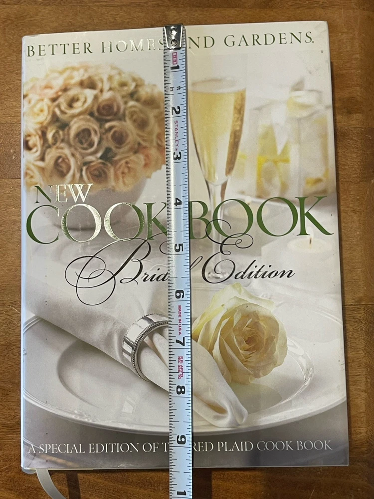 Better Homes & Gardens New Cook Book Bridal 12th Edition, White Hard Cover. Beautiful cover, great information for newlyweds & first time home cooks, measurements, advice on entertaining as well as detailed recipes. In excellent condition, no tears or stains, no repairs, no fading. From a clean non-smoking home.