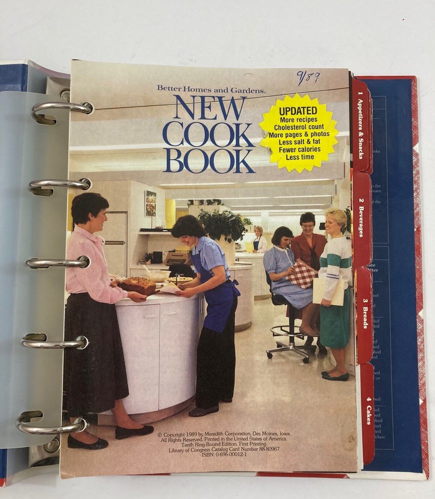 DESCRIPTION : This listing features a clean and well cared for Better Homes & Gardens New Cook Book HB 5 Ring Binder 1989. I see just one page of writing. Thank you for looking!! *This item is from a Smoke-Free Home. *Sales Tax may apply. *Tracking/Delivery Confirmation is included. You will automatically receive tracking number and information when item is shipped. SHIPPING : For some items I cannot ship together because they are either media mail or 1st class and would bump up to another weight class when combined, costing you more in shipping. Media items (particularly books) cannot be combined with the shipping cost of other items. Shipping costs are shown to you up front BEFORE you buy so if it is not what you want to pay, please do not buy the item. I make every effort to accurately calculate shipping based on weight, packaging and distance traveled. INTERNATIONAL BUYERS : * I ship internationally through Ebay?s International Global Shipping program. Therefore, I cannot have items shipped together according to their policy. No shipping discounts will be given for International buyers. International Buyers?.Import duties, taxes and charges are not included in the price or shipping cost. These charges are the buyer?s responsibility. Please check with your country?s customs office to determine what these additional costs will be prior to bidding or buying. COURTESY : Please contact me if there is a problem with your purchase. I make every effort to do things the right way by finding items my customers want and shipping them promptly. Sometimes mistakes happen due to human error so let me correct any problems if they occur. PACKAGING : Most plush toys are shipped in a secure shipping bag. Most books and media items are shipped in a manilla bubble envelope.