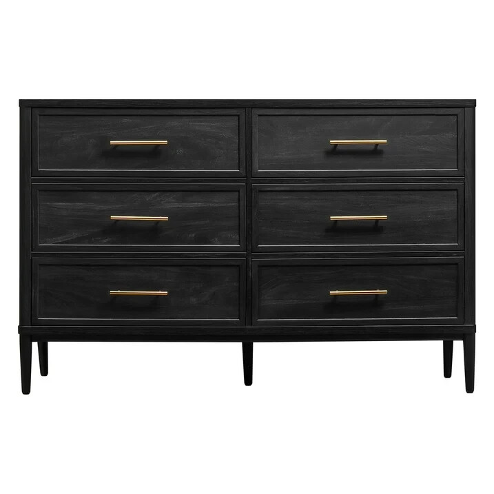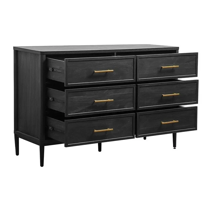 Better Homes & Gardens Oaklee 6 Drawer Dresser, Charcoal Finish Product Description: Add stylish bedroom storage with the Better Homes & Gardens Oaklee 6-Drawer Dresser in Black Wood. This contemporary dresser features six extra-deep drawers and raised legs with rounded edges for an elegant look. Style it in your bedroom for clothing or as a storage console in your entryway, hallway, or office. The wide tabletop is the perfect size for lighting, storage trays, and décor, while the sturdy metal legs ensure long-lasting durability. Finished in a smooth, glossy charcoal with natural wood texture and gold handles, this dresser makes a great addition to any room. Pair it with matching contemporary furniture from the Better Homes & Gardens Oaklee Collection to complete the look. Better Homes & Gardens Oaklee 6-Drawer Dresser, Charcoal Finish Assembled Dimensions: 56.5” L x 18.5” D x 36.1” H Product Weight: 151.9 lb Color: Charcoal Material: Engineered wood, metal legs and hardware Package Dimensions Box 1: 60*21.34*7.95"H, 121 lb Package Dimensions Box 2:30.7*20*9.25"H, 73.66lb Contemporary style Better Homes & Gardens ‘Oaklee’ Collection 6 smooth-gliding, deep drawers Gold hardware Assembly required Cleaning and Care: Clean with dry cloth