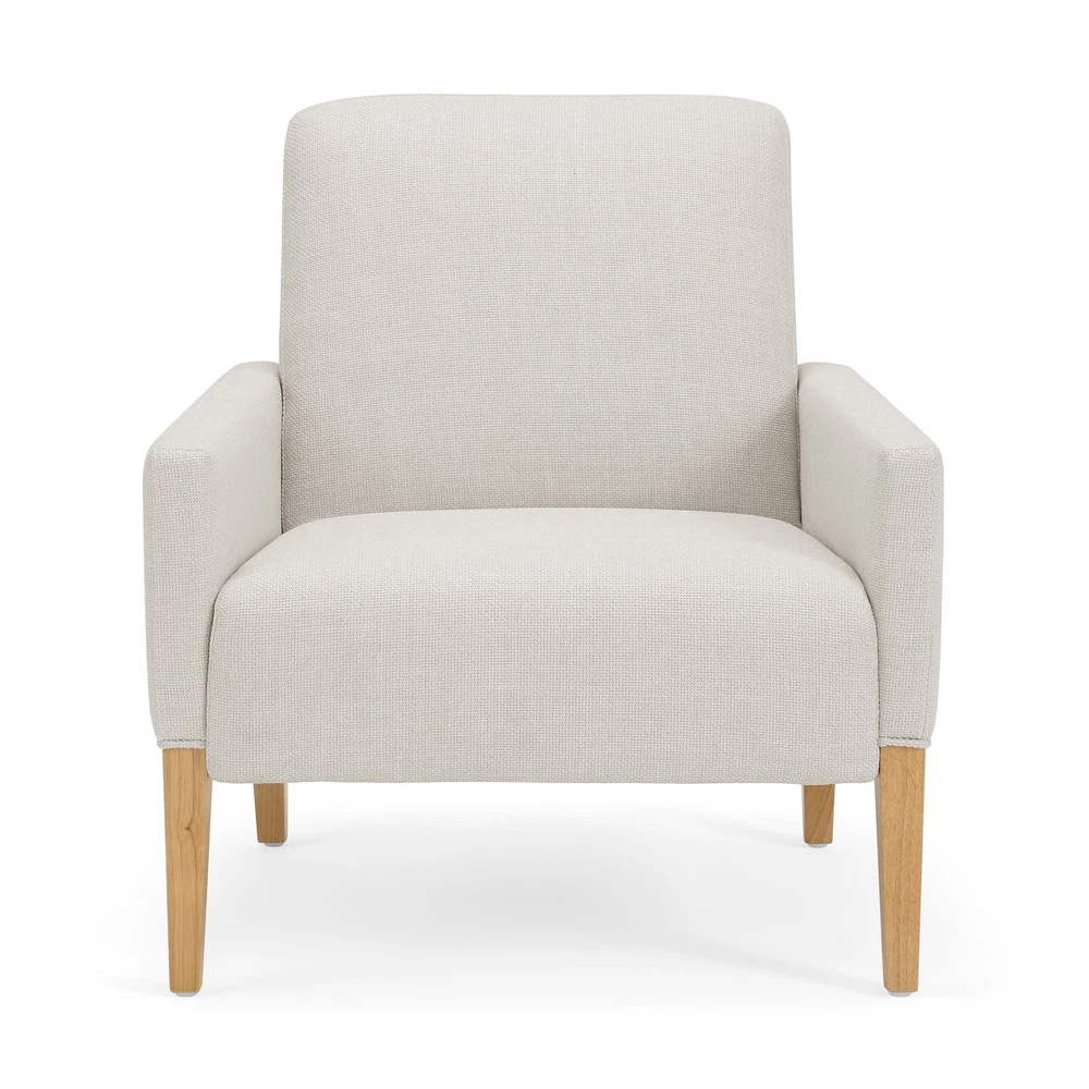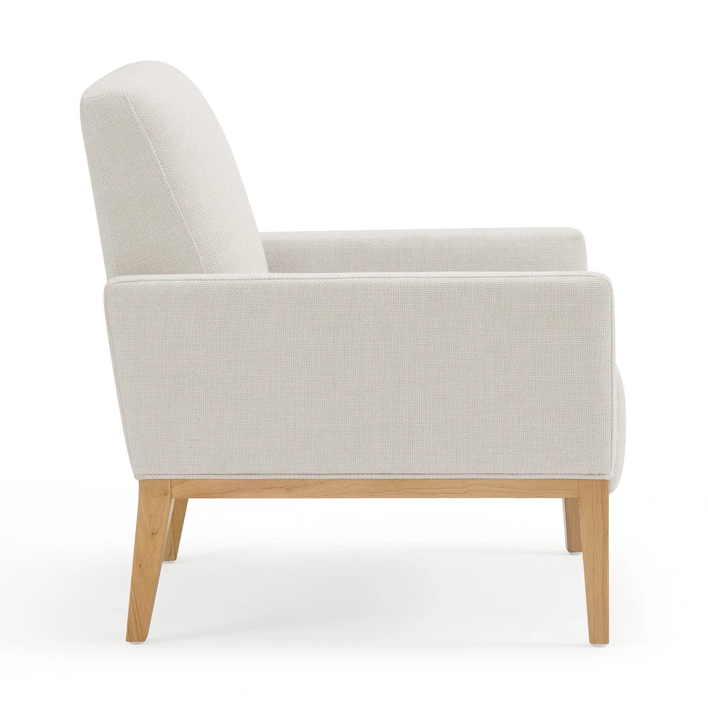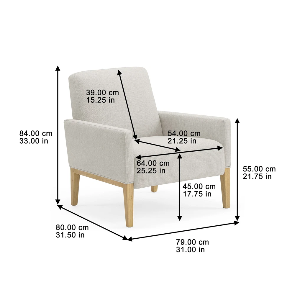 The Better Homes & Gardens Reading Accent Chair, Cream, combines comfort and style in one stylish piece. With a beautiful cream fabric and light wood legs, this chair elevates any living space. Plush Dacron and high-density foam cushions provide relaxing support, while the webbed seat suspension ensures durability. Easy to assemble, this sturdy chair offers long-term comfort and aesthetic appeal in any room. Superior comfort with Dacron and high-density foam cushions Webbed seat suspension for extra support Ready to use out of the box, no assembly required Seat Height: 33'' Seat Width: 30.31'' Seat Depth: 31.5'' Weight Capacity: 300 lbs.