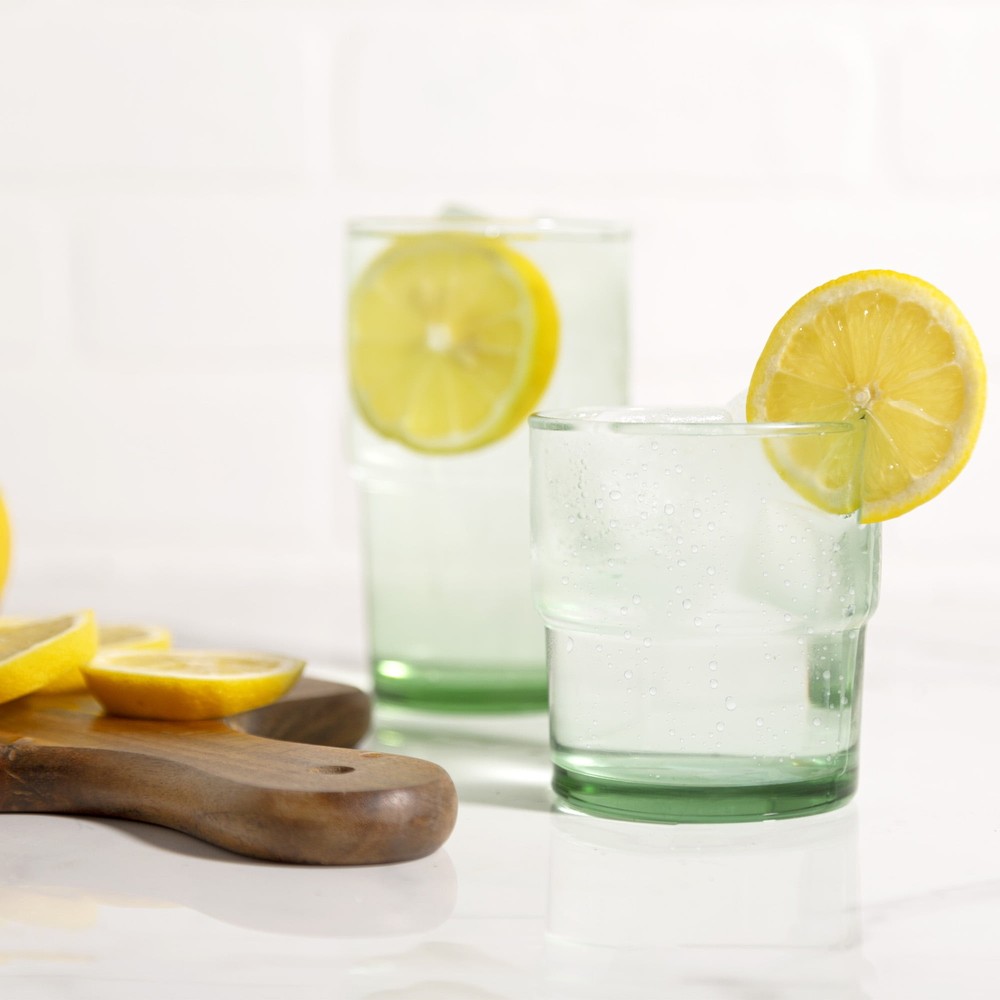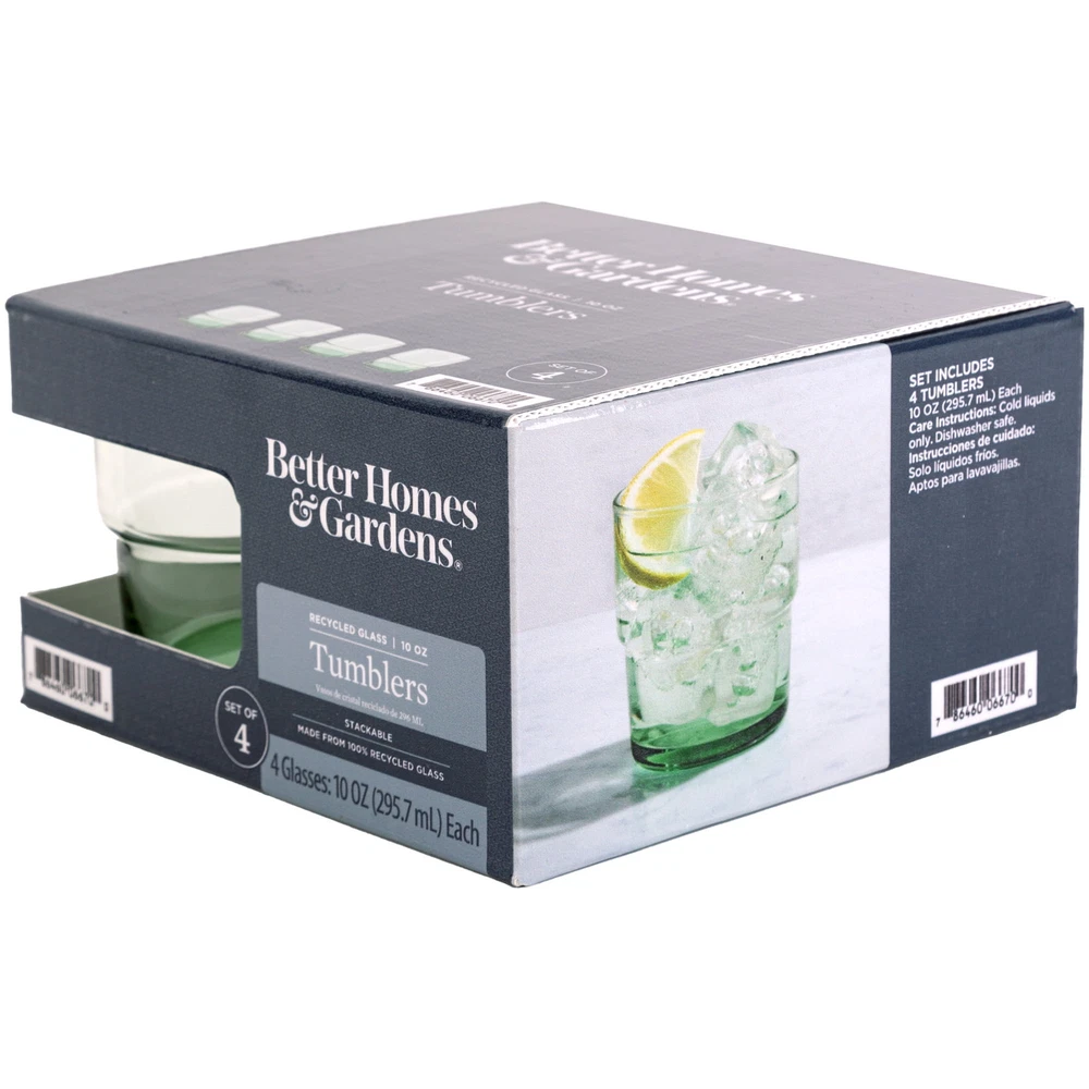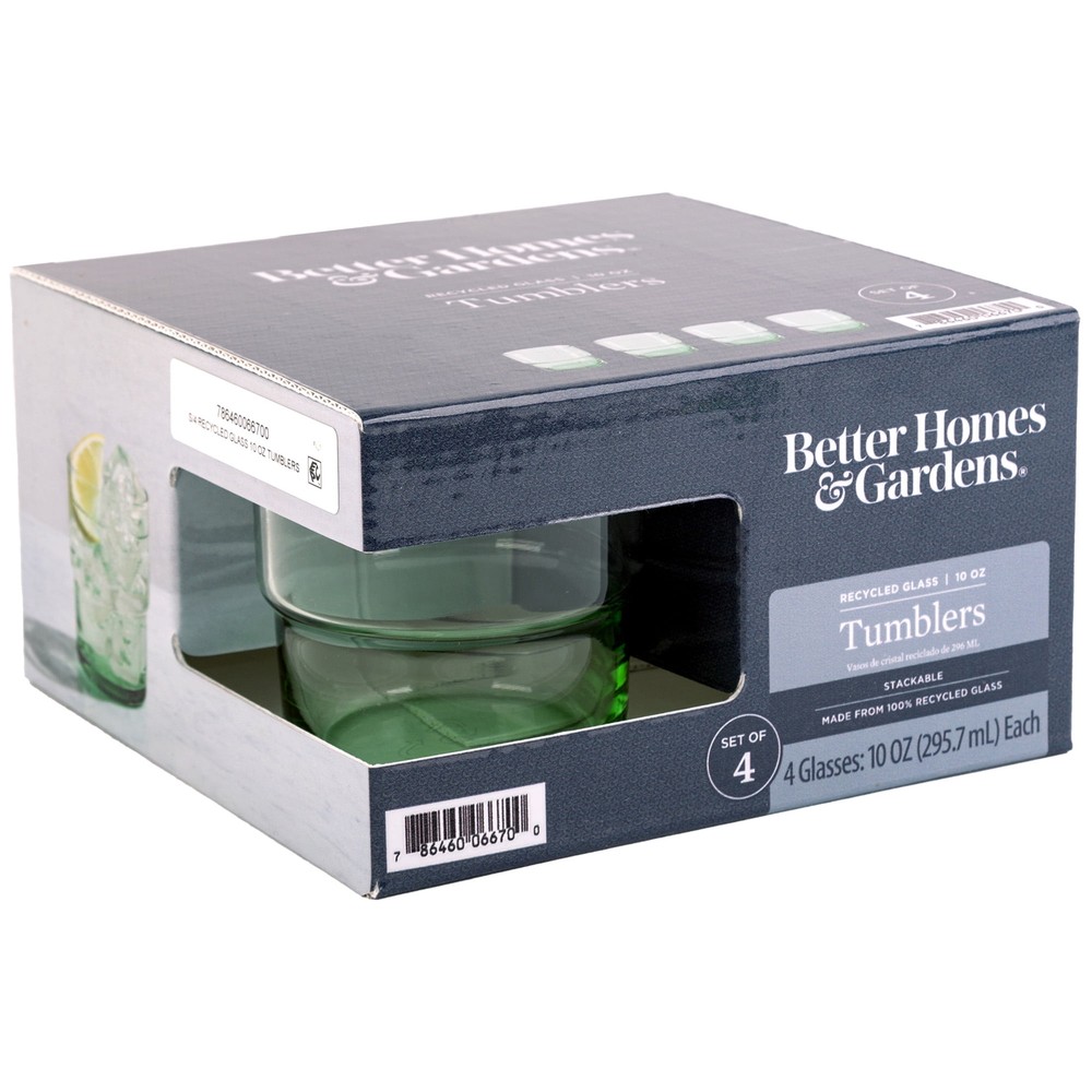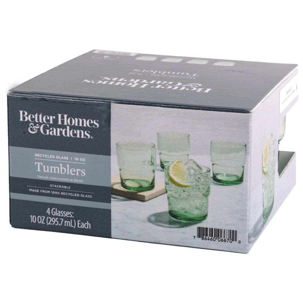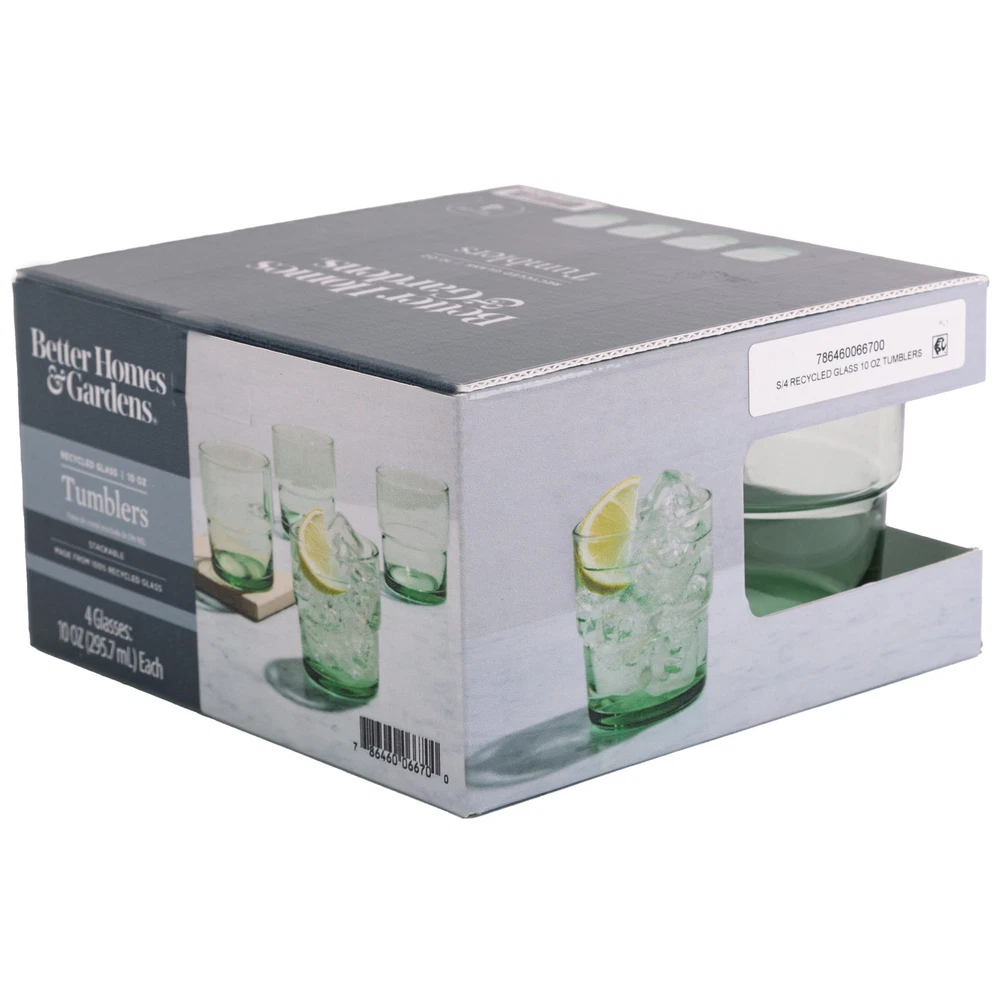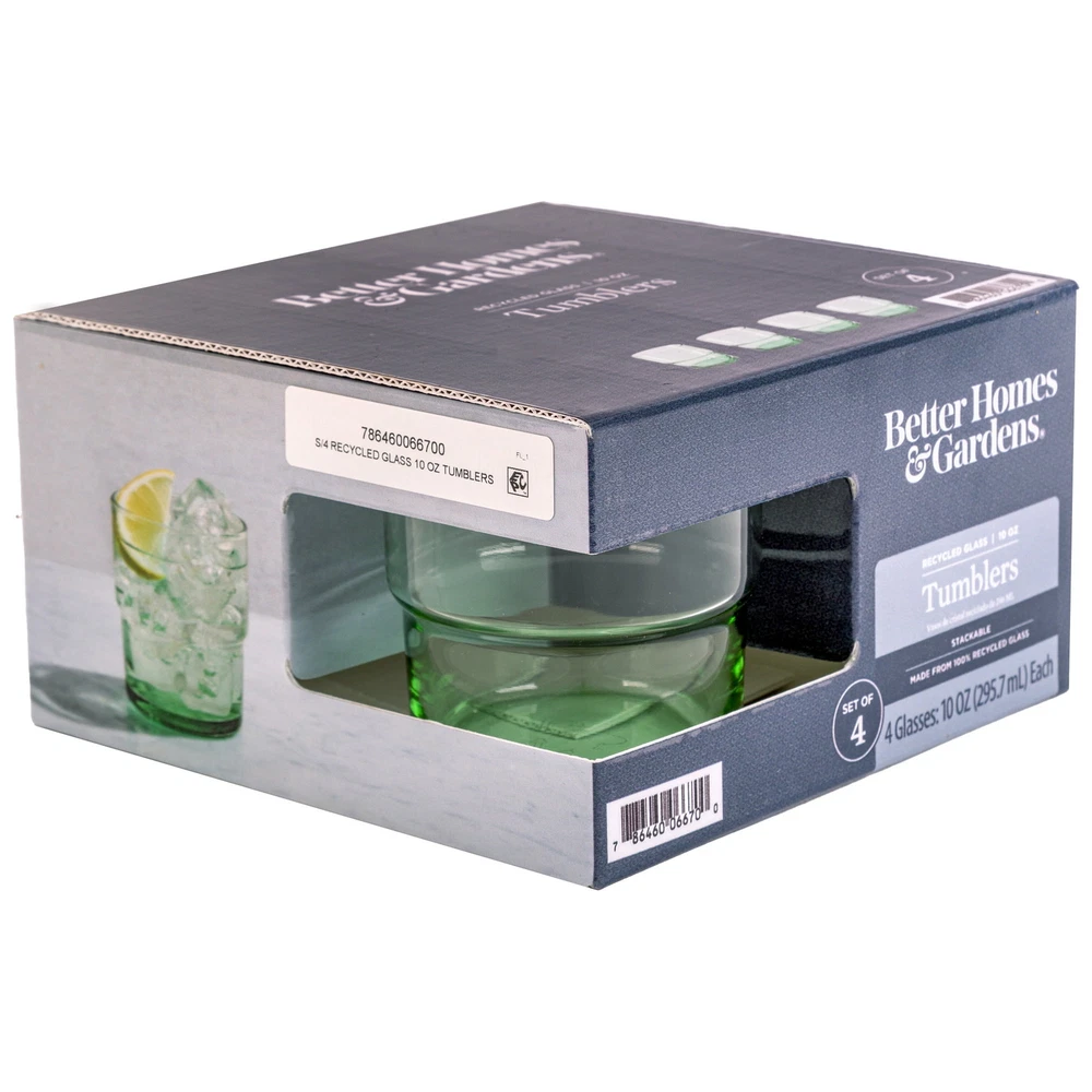 Better Homes & Gardens clear green glassware, 4pk, 10 oz. These glasses are made from 100% recycled glass and have a beautiful green tint from the Recycled Glass. The slimmer cylindrical base allows for compact stacking, saving precious cabinet space .Each glass also has a pleasing thickness that makes them durable for everyday use, enjoyable to hold and timelessly stylish. Dishwasher safe and made to last. Made in Turkey Glassware and Packaging are recommended to be Recycled at your local commercial recycling facility. Check to see if an appropriate facility exists in your area. 4 pk glasses each 10 oz Made in Turkey Made from 100% recycled glass Dishwasher safe