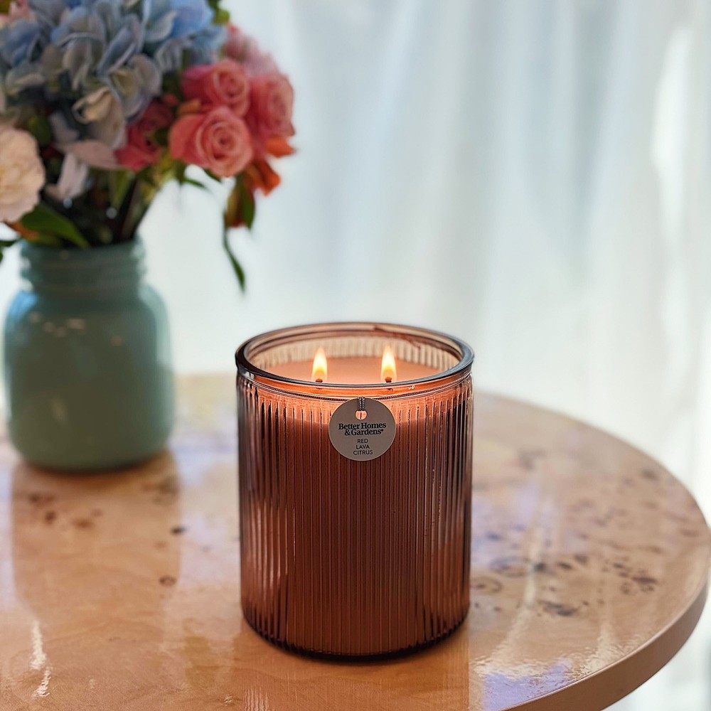 Better Homes & Gardens Red Lava Citrus Scented 2-Wick 17.1oz (480.77 g) Ribbed Jar Candle - Emitting a warm, golden light, this candle fills your space with an indulgent fragrance. Notes of Mango, Mandarin, Red Currant, Blood Orange, Lemon Leaf create a delightful atmosphere. The ribbed glass jar houses a paraffin wax blend ideal for various rooms and décor styles. Crafted with care, this candle features an embossed ribbed glass design with a 2-wick design for a consistent, pleasant burn experience. Its versatile, contemporary style seamlessly integrates with any décor. On Apr 30, 2025 at 01:41:42 PDT, seller added the following information:
