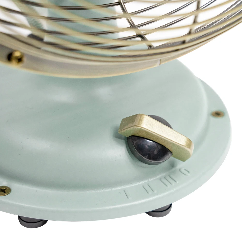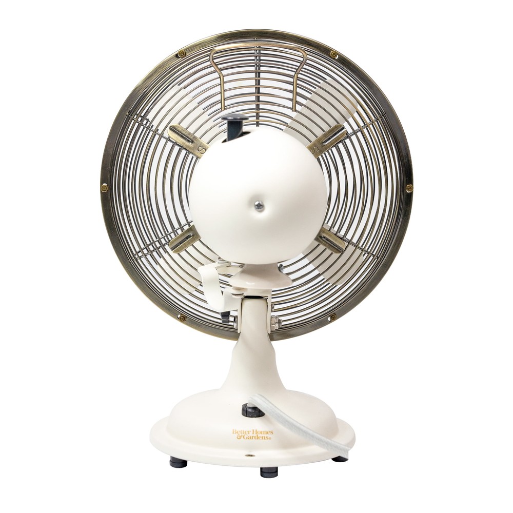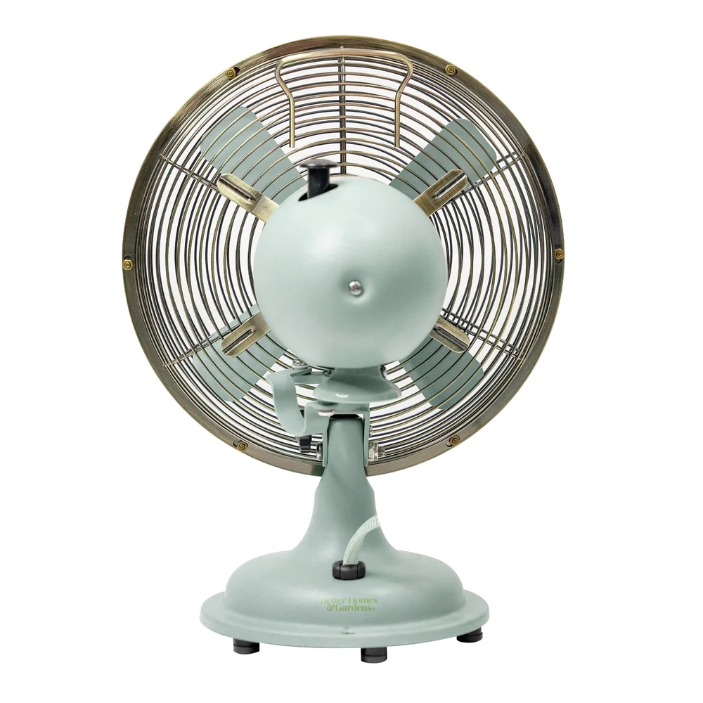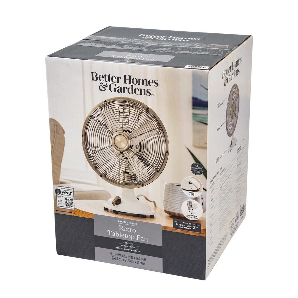Maintain the perfect comfort level in almost any room with the new Better Homes & Gardens 8 inch 3-speed metal table fan. Designed for taking up a small footprint on desks, tabletops, shelves, and other spaces, this vintage-looking fan features your choice of three speeds, oscillation, and a tilting head to provide the perfect angle of air circulation. The Better Homes & Gardens 8 inch retro 3-speed metal table fan is perfect for both large and small rooms including bedrooms, dining rooms, living rooms, dens, playrooms, offices, classrooms, dorm rooms, and more. The Better Homes & Gardens retro 12 inch 3-speed metal table fans and Better Homes & Gardens 16 inch retro 3-speed metal standing fans are also available. Retro-styled, vintage looking table fan Durable metal construction for a long life Offers three different speed settings and oscillation to keep air moving through rooms Comes new out of box