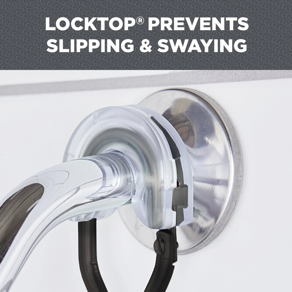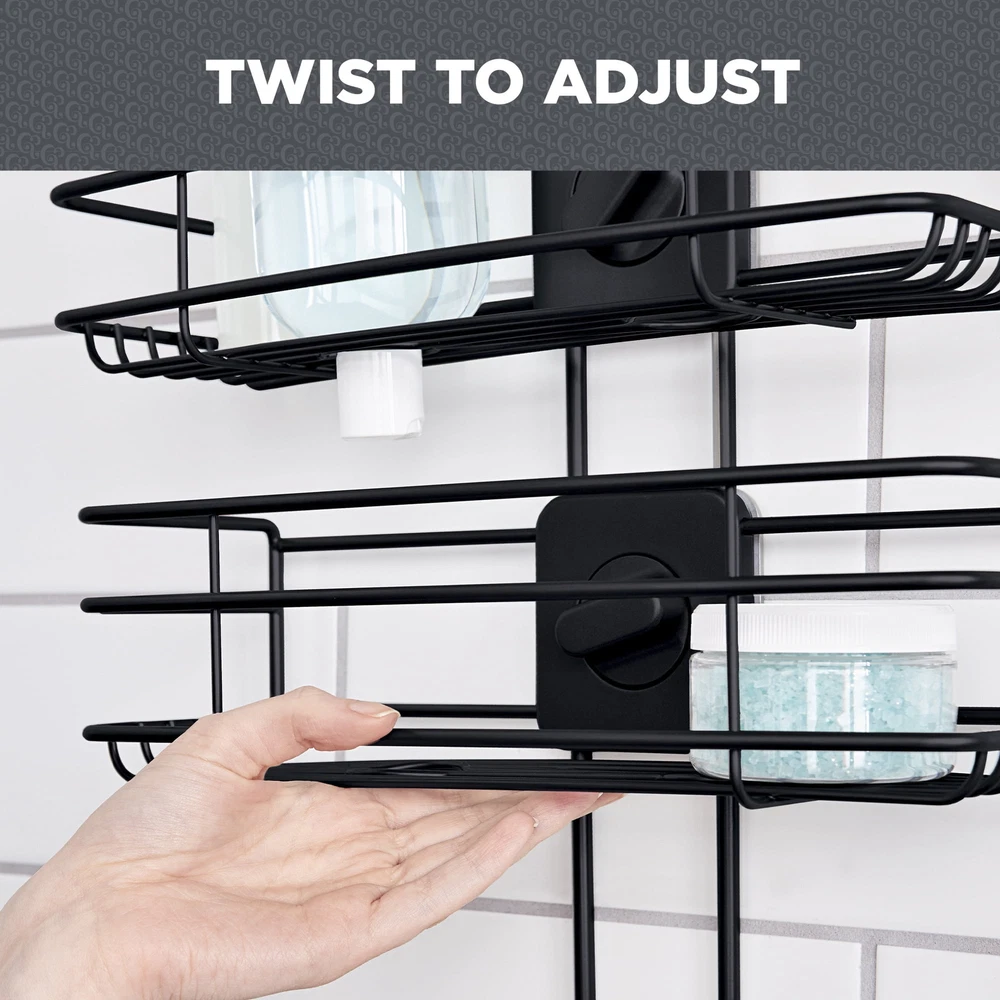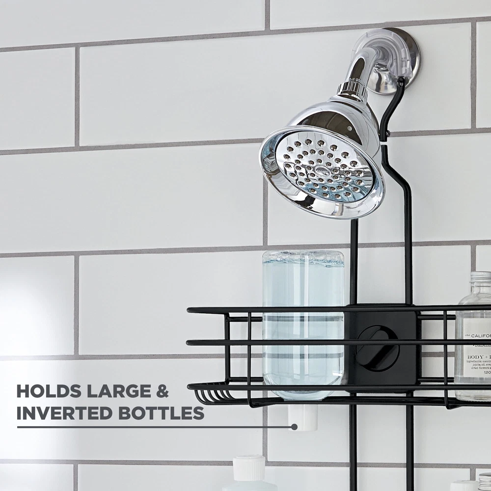 Product details Control your shower space with the attractive and functional Better Homes & Gardens Adjustable Shower Caddy. This rust-resistant shower caddy uses Lock Top technology to securely install on any showerhead. Its 2 shelves adjust 4 different ways to customize storage. The baskets hold bottles and more. Inverted bottle storage is built in for quick and easy dispensing. The bottom has a soap dish and hooks for body poufs, washcloths and razors. Shower head caddy's Lock Top closure secures caddy to shower head (includes hex key to tighten) Baskets adjust up, down and sideways for multiple storage options Includes 2 shelves (basket style) for storing bottles and more Soap dish with hooks for body poufs, washcloths, razors and more Holds extra large and inverted bottles Dimensions: 12.25 in. W x 5 in. D x 27 in. H