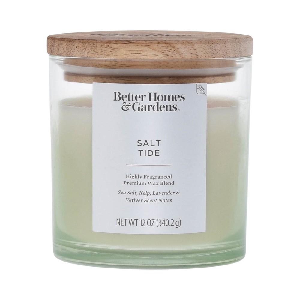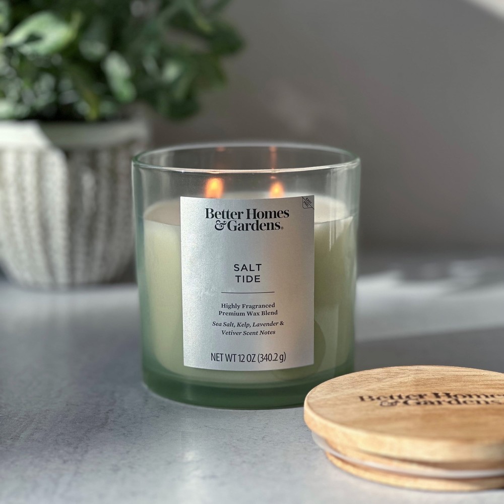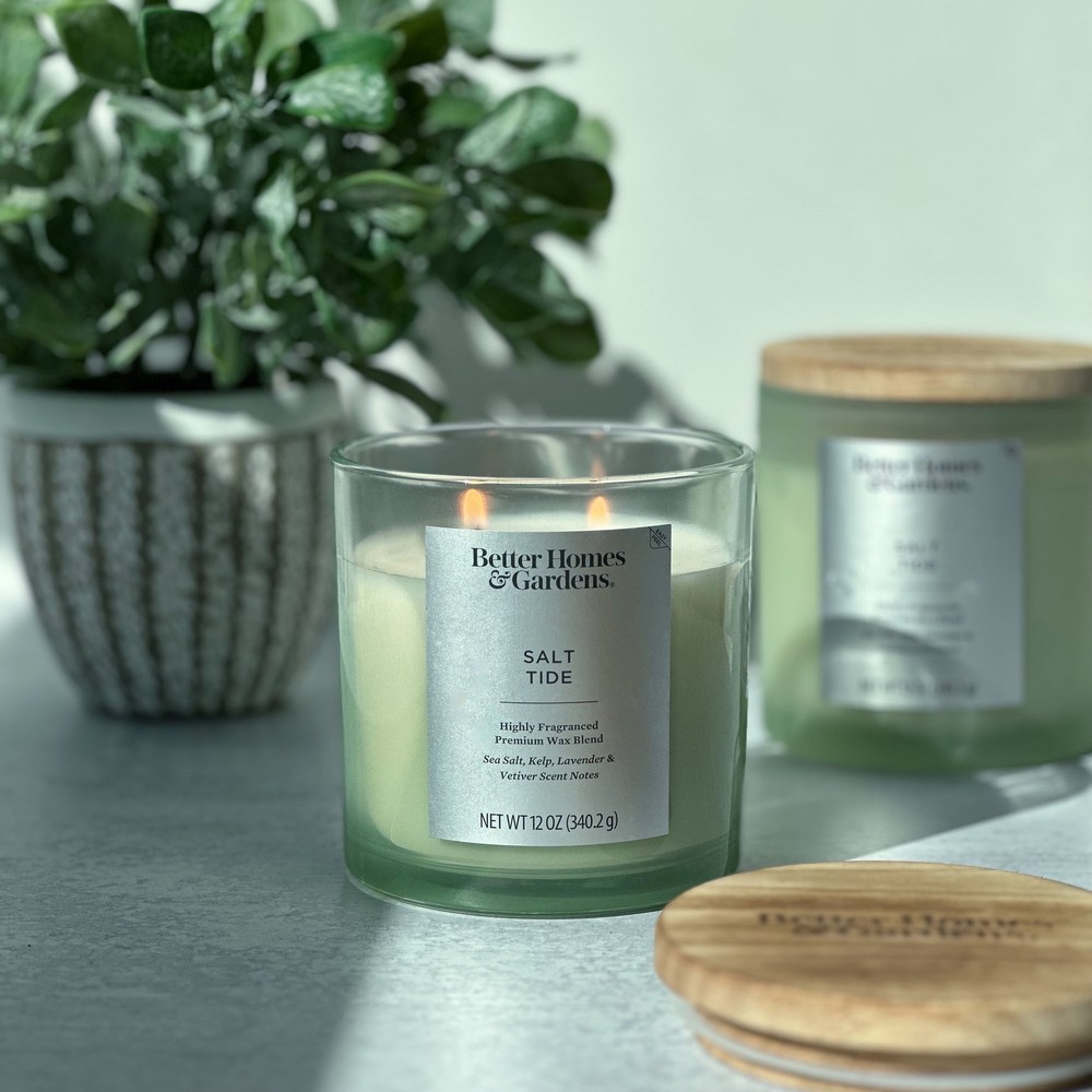 Better Homes & Gardens Salt Tide Scented 2-Wick 12oz (340.2 g) Ombre Jar Candle - Emitting a warm, golden light, this candle fills your space with an indulgent fragrance. Notes of Sea Salt, Kelp, Lavender, Vetiver create a delightful atmosphere. The frosted glass jar with a carbonized printed wood lid houses a paraffin wax blend ideal for various rooms and décor styles. Crafted carefully, this candle features a printed frosted glass design with a 2-wick design for a consistent, pleasant burn experience. Its versatile, contemporary style seamlessly integrates with any décor. On Mar 13, 2025 at 21:34:14 PDT, seller added the following information: