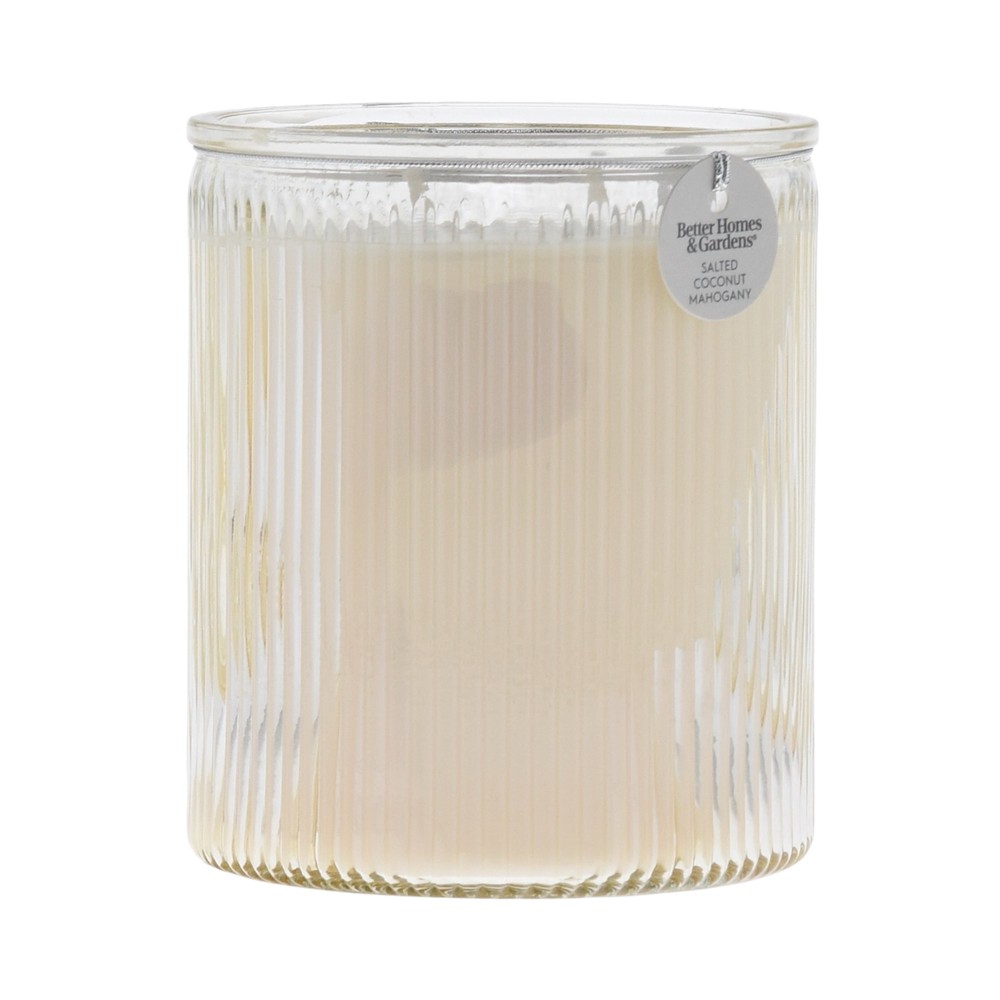 Product details Better Homes & Gardens Salted Coconut & Mahogany Scented 2-Wick 17.1oz (480.77 g) Ribbed Jar Candle - Emitting a warm, golden light, this candle fills your space with an indulgent fragrance. Notes of Citrus, Herbal, Wood, Coconut & Vanilla create a delightful atmosphere. The ribbed glass jar houses a paraffin wax blend ideal for various rooms and décor styles. Crafted with care, this candle features an embossed ribbed glass design with a 2-wick design for a consistent, pleasant burn experience. Its versatile, contemporary style seamlessly integrates with any décor. Scent Notes: Citrus, Herbal, Wood, Coconut & Vanilla Includes: 17.1oz (480.77 g) Ribbed Jar Candle Wicks: 2 Wax: Paraffin Wax Blend Burn Time: 40 Hours Why you’ll love it: Customers will love this candle for its inviting fragrance, stylish design, and consistent burn, making it a versatile choice for enhancing any space. Fragrance Pro Tip: Let the wax harden before relighting, touching, or moving. Country of Origin: Imported