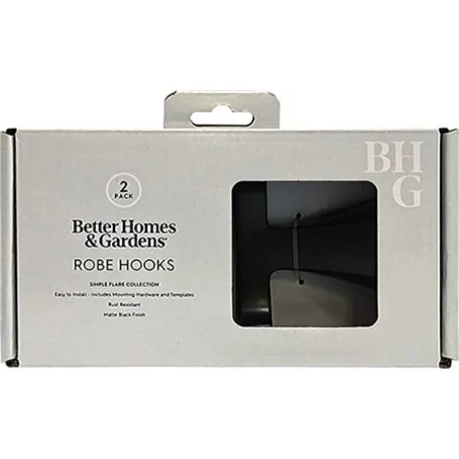 Better Homes & Gardens Simple Flare Collection Wall Mount Robe Hook 2 Pack Matte Black Finish.Check out our Simple Flare Collection and finishes in our full line of Better Homes and Gardens products.Stable metal structure protect corrosion & rust, ensuring durability and dependability., Multi-applications & Multi-Functions Hook is ideal for hanging towel, coat, hat, bag, belt, key, scarf, suitable for bathroom, kitchen, bedroom, restroom, garage, laundry room, hotel, RVs, campers, boats and cabins.Surface Treated MATTE BLACK finish create a simple and elegant appearance.Easy Assembling Concealed screws design, easy installation and secure attachment, hardware package included installation guide and stainless steel screws., You Will Get 2 pieces bathroom towel hooks and 1 set mounting accessories, Better Homes & Gardens Simple Flare Wall Mount Robe Hook 2 Pack Matte Black Finish Recommend Rooms: Bathroom Wall Mount Hardware Included Popular and high quality finish Easy to Install and easy clean