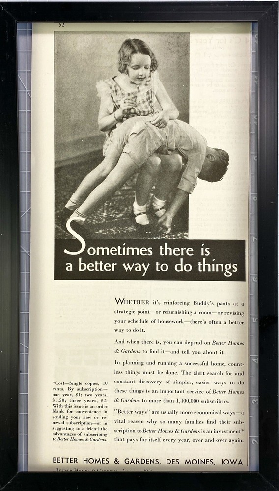 This vintage print ad from Better Homes & Gardens is a rare find for collectors of advertising memorabilia. The monochrome design and original 1936 creation make it a unique piece that showcases the evolution of marketing over the years. The ad features the iconic "Sometimes there is a better Way to do things" slogan and is in its original form, making it a valuable addition to any collection. The ad was manufactured in the United States, adding to its historical significance. This item is perfect for those who appreciate vintage advertising and want to add a rare piece to their collection. Item description from the seller (This Listing is for paper advertisement ONLY!)(Frame not Included) Better Homes & Gardens "Sometimes there is a better Way to do Things" Des Moines, Iowa. Vintage Print Ad 1936 Better Homes & Gardens January 1936 About 5.5 x 11 Inches. Carefully shipped. Condition: Used: Condition is shown in the photos; please use zoom function to see details of edges, etc.. Additional Condition Information may be found in the description above. This is an original magazine print ad . The page was carefully removed from a vintage magazine. Normal wear associated with an old print ad may include small creases, a corner bump, edge/corner wear, age toning etc. We combine shipping on additional Magazine Ads and Covers which ship for FREE. Please wait to make any payments until you receive a combined shipping invoice. This offer applies to Magazine ads and Covers ONLY! (Does not include clothing and other categories!) If you have any questions, please don't hesitate to contact us. Your business is important to us. Payment is expected within 4 days. If payment is not received your order may be cancelled. (As per eBay Policy) Returns are accepted. We appreciate your business and strive for your 5 star feedback! Want more original vintage and antique items? Please visit our store βFAAME us Findsβ