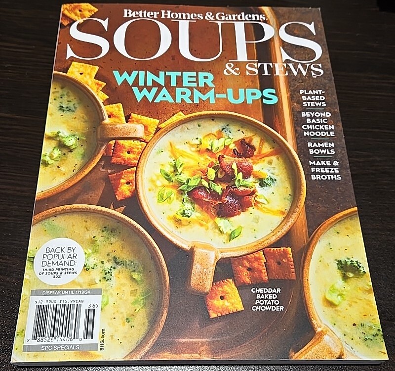 Indulge in the warmth of winter with this latest edition of Better Homes & Gardens Soups & Stews magazine. The pages are filled with delicious recipes to keep you warm and cozy throughout the season. This issue includes timeless classics and new twists on old favorites, all sure to satisfy your taste buds. With a focus on home and garden, this issue of Better Homes & Gardens Soups & Stews is perfect for those who love to cook and entertain. From hearty soups to savory stews, there is something for everyone in this issue. So why not pick up a copy today and start cooking up some winter warm-ups?