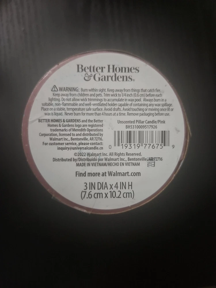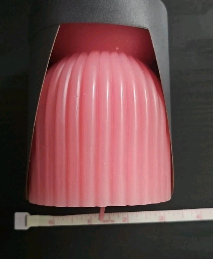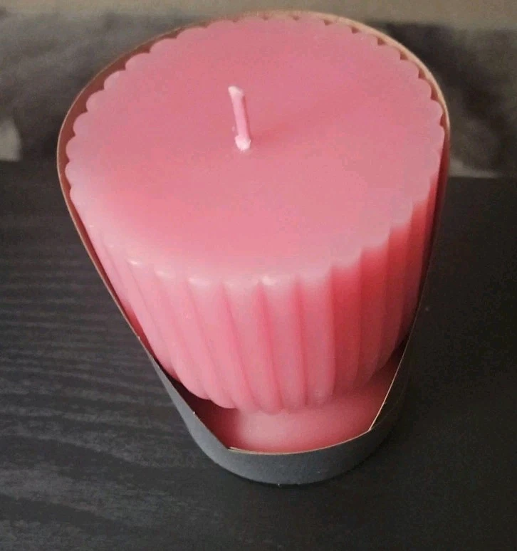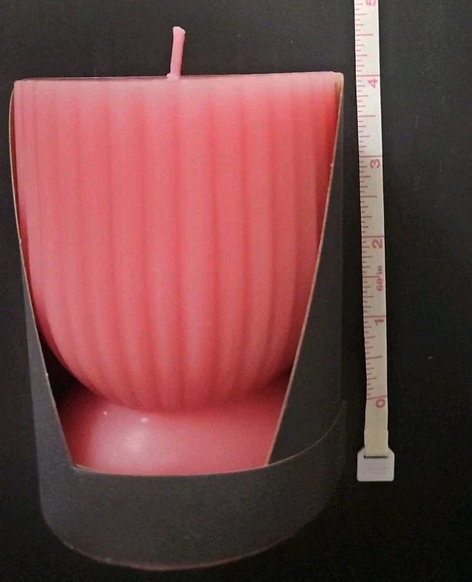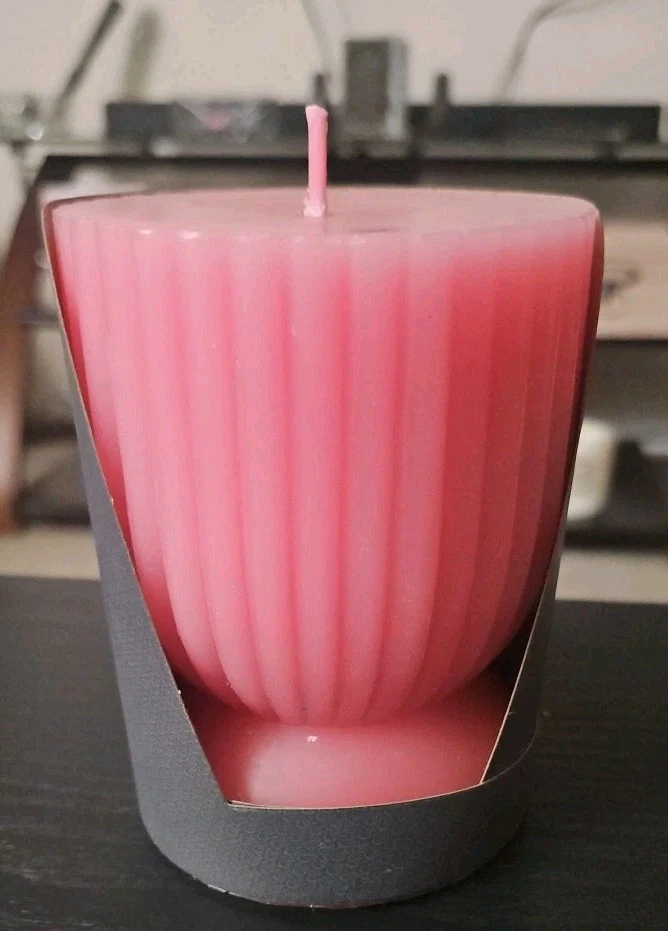 The Better Homes & Gardens Unscented Ribbed Pillar Candle is a medium-sized, round-shaped candle in a vibrant pink color. It stands at 4 inches tall and 3 inches wide, with a single wick for easy lighting. Made of wax and manufactured in Vietnam, this pillar candle is perfect for adding a pop of color to any room without any added scent. The candle comes in new in box (NIB) condition.