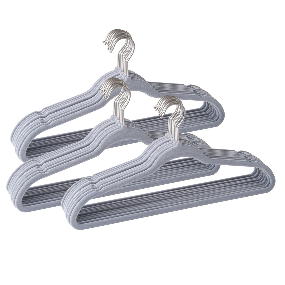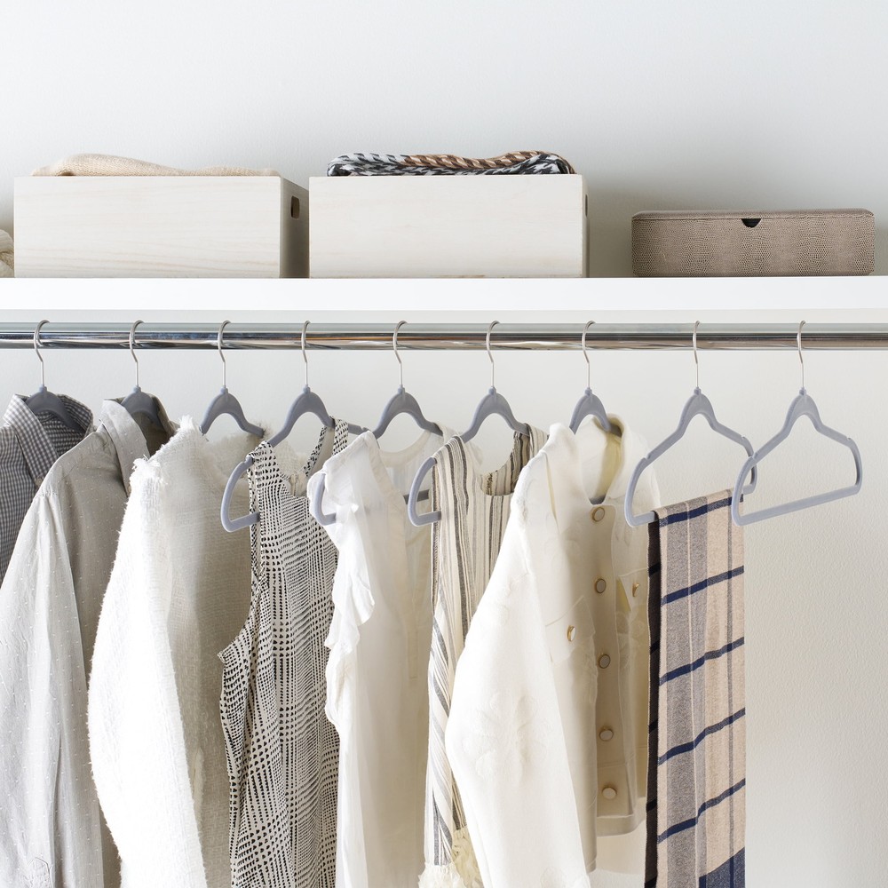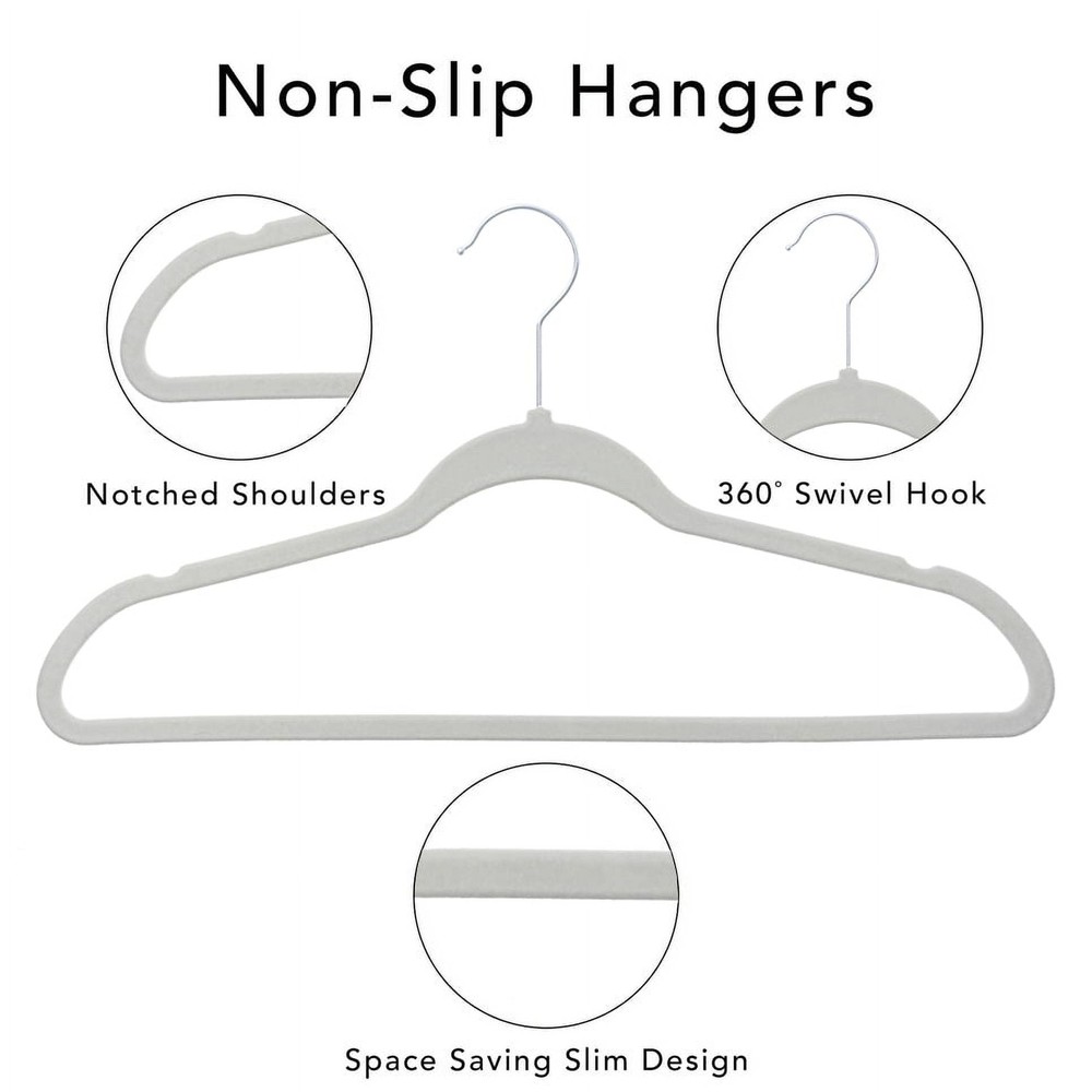 Our Better Homes and Gardens Ultra Slim adult hangers will help to organize Organize your clothing with both style and functionality using the Better Homes & Gardens Non-Slip Velvet Clothing Hangers. Designed to effectively keep your closet organized with slim, space saving construction, these stylish grey hangers are also non-slip with non-damaging. This 30-pack of non-slip hangers is thoughtfully designed two side indentations to help keep your clothes in place. These elegant and modern non-slip hangers are perfect for any space where you hang garments from kids' rooms to your chic primary suite or walk-in. Use in hallway closets or guest rooms to impress all that come into your home, and happily say goodbye to the days of shabby, mismatched hangers. Expertly care for your clothing and present your items in a way that gets you excited to dress in the morning. Use the Better Homes & Gardens Non-Slip Velvet Clothing Hangers for contemporary flair you're sure to appreciate! Clutter can accumulate and make your home feel smaller than it actually is. Organize your belongings with the right storage solution. Storage bins and boxes are great for toys and books. Save space in your bathroom or laundry room with a new hamper. Closet and shoe organizers are a great addition to your bedroom if you feel that you can never find the right outfit and want your wardrobe to take up less space. Better Homes & Gardens 30 nonslip ultra slim adult hangers included in 1 package Effective non-slip hangers - textured exterior is perfect for keeping clothes off your closet floor Durable synthetic material with a wire neck and hook - felt non-slip outer layer Neutral and classic gray color for a chic and organized look in your closet Includes petite indentations to hang tank tops, skirts, pants, blouses and more Large size ideal for shirts, skirts, tank tops, sweaters and more Non-Slip, Ultra Slim and Space Saving - can also be used for both wet and dry clothing