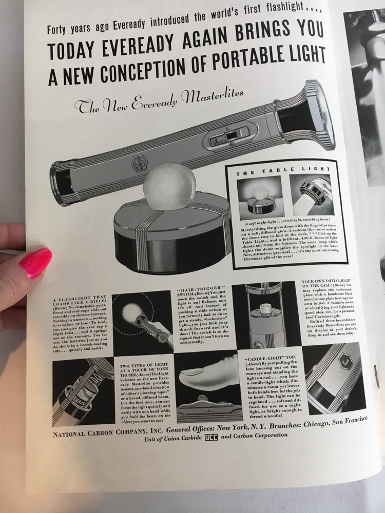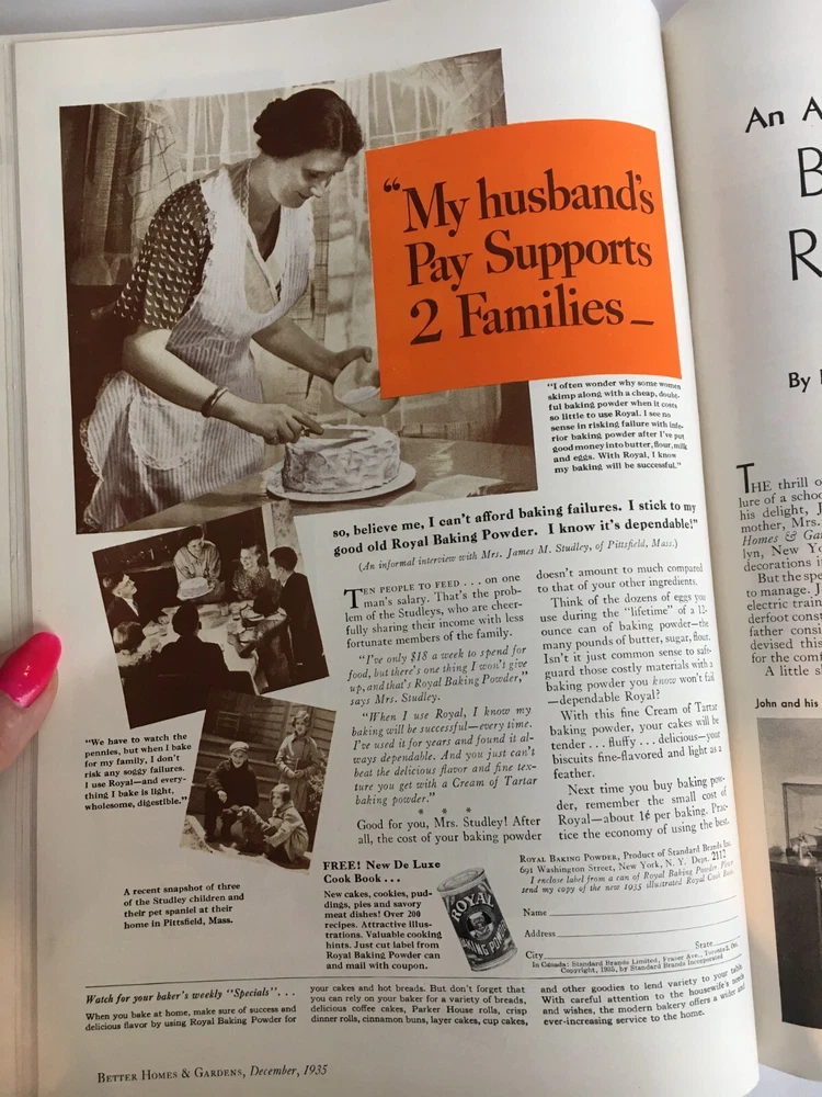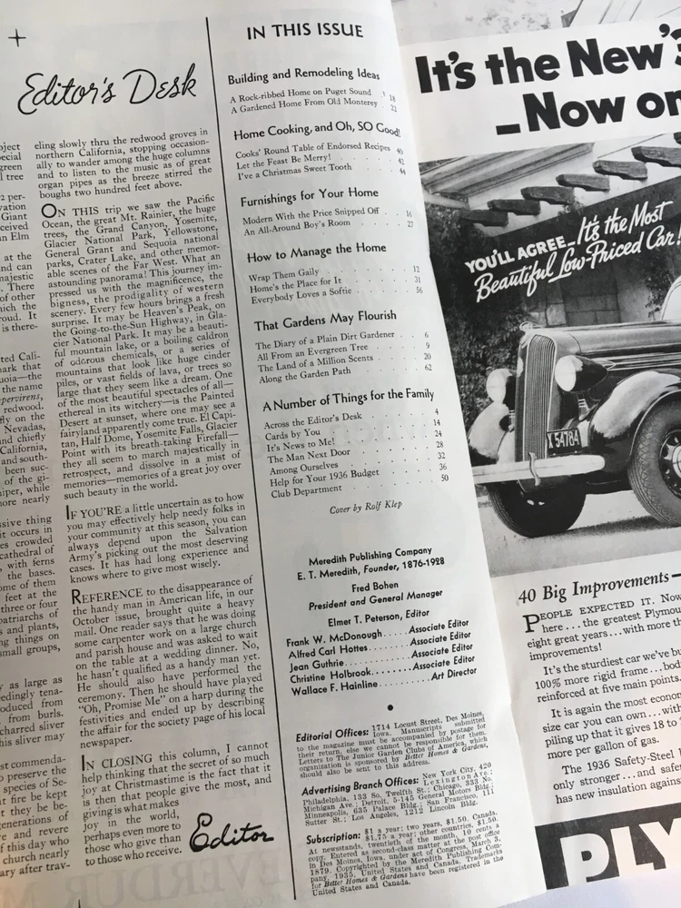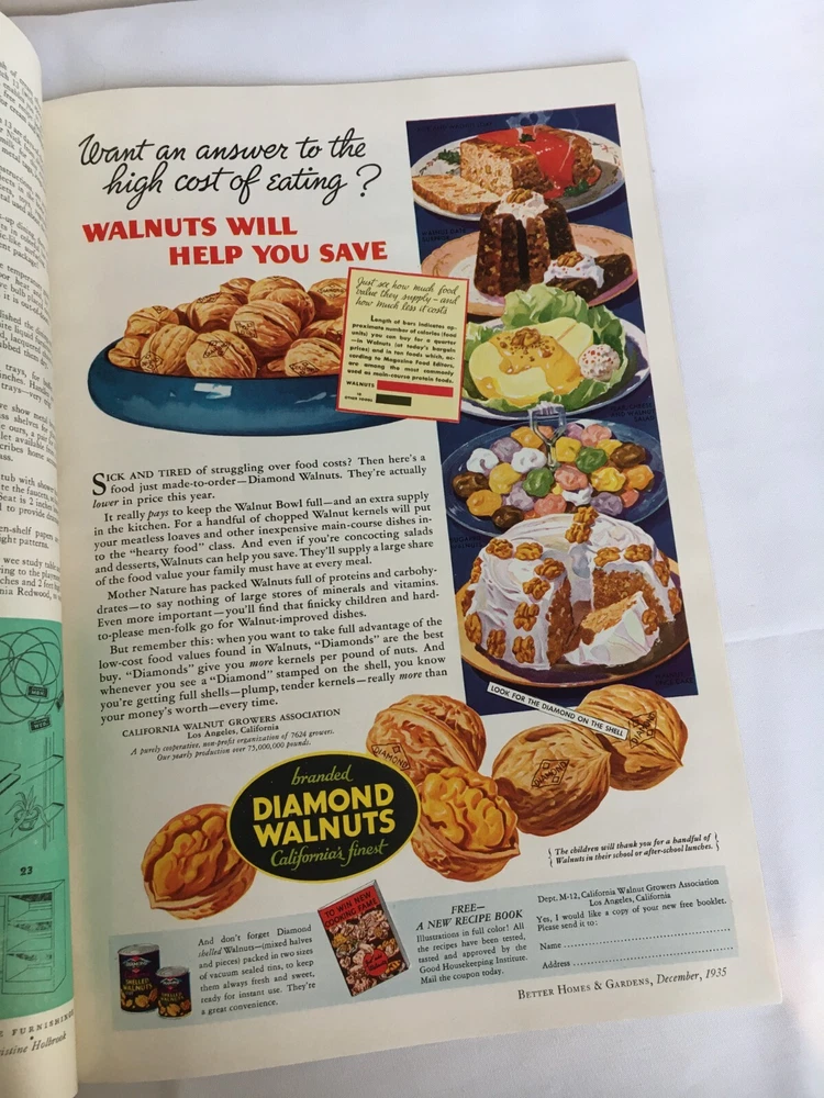 *The cover shows a little wear and there is an area near the bottom of the back cover that had been torn off and taped back (see photo). This magazine has an old smell. This is a Vintage December 1935 Better Homes & Gardens Magazine. It contains some great articles, pictures, recipes, house plans as well as old advertisements. Would be a unique gift Idea. I like how soft the pages feel. Measurements - 12" x 8 1/4" x 1/8" (Item 3143V-BkShlf)