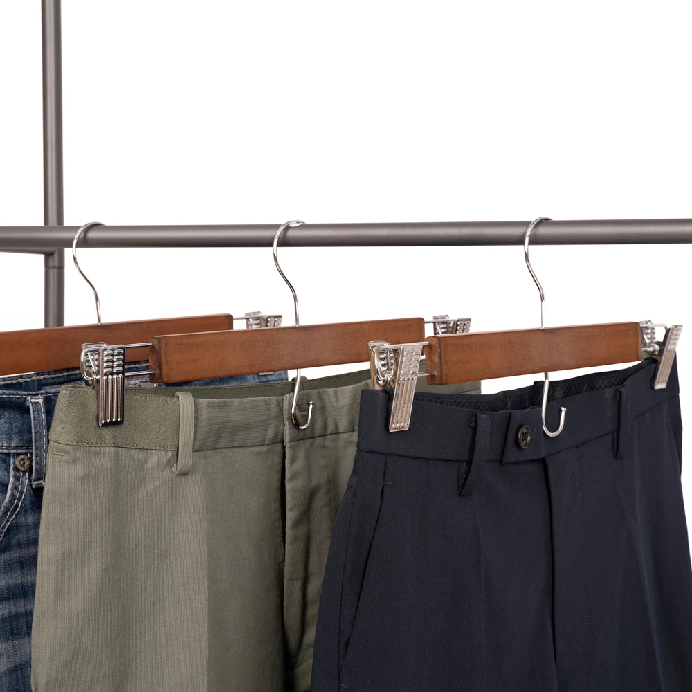 Product details These are the all new Better Homes & Gardens Set of 3 Solid Wood Pant & Skirt Hangers Walnut Finish. Better Homes & Gardens has recently revised their wooden hangers to have a unique and eye-catching Walnut finish which brings new life to any closet being utilized. The hangers have a sturdy construction and are durable to hold up to any need of holding clothing up in a clean presentation. Each hanger comes with a clip on each side of the hanger to hold pants to help avoid wrinkling. The hangers also have a small hanger attached to the bottom to hang other items and some small accessories. Don’t get left with a bunch of clutter, simply organize it with the all new Better Homes & Gardens Solid Wood Suit Hangers with Walnut Finish set of 5. The unique design combines 2 styles of hangers into one ingenious product One single hanger can easily accommodate a suit jacket or blazer plus a pair of slacks or a skirt Hanger uses clips rather than a hanging bar, pants or skirts stay firmly in place and never wind up on your closets floor Newly designed Walnut Wood Finish Horizonatl Pants Hang Bar Fit's in atmoshphere Reduces creases and wrinkling Space saving design The unique design combines 2 styles of hangers into one ingenious productOne single hanger can easily accommodate a suit jacket or blazer plus a pair of slacks or a skirtHanger uses clips rather than a hanging bar, pants or skirts stay firmly in place and never wind up on your closets floorNewly designedWalnut Wood FinishHorizonatl Pants Hang BarFit's in atmoshphereReduces creases and wrinklingSpace saving design