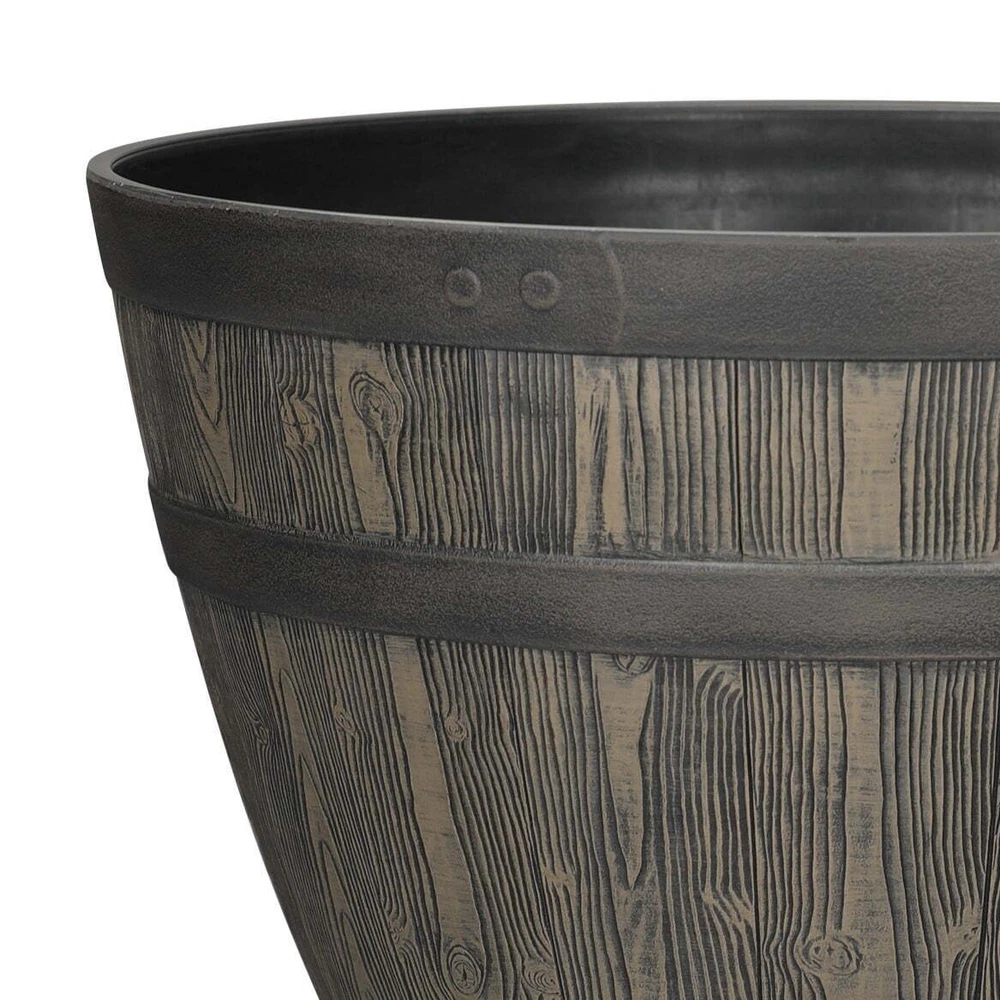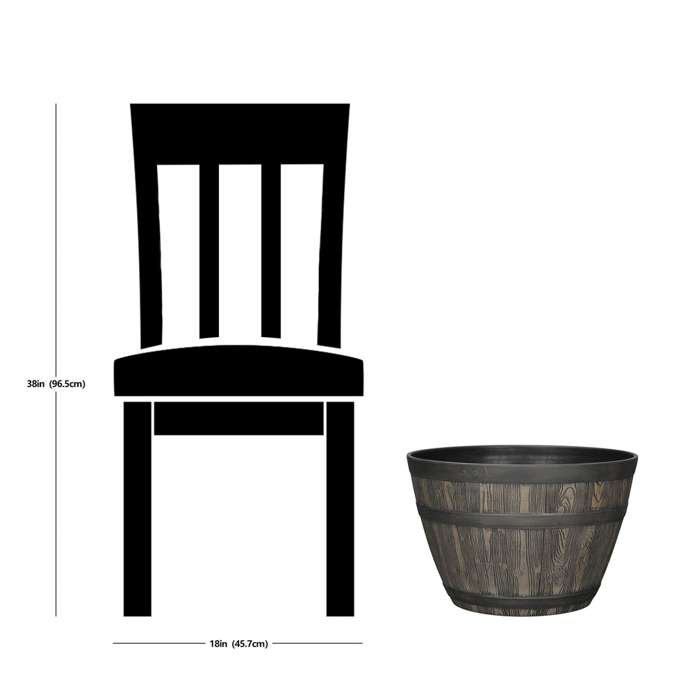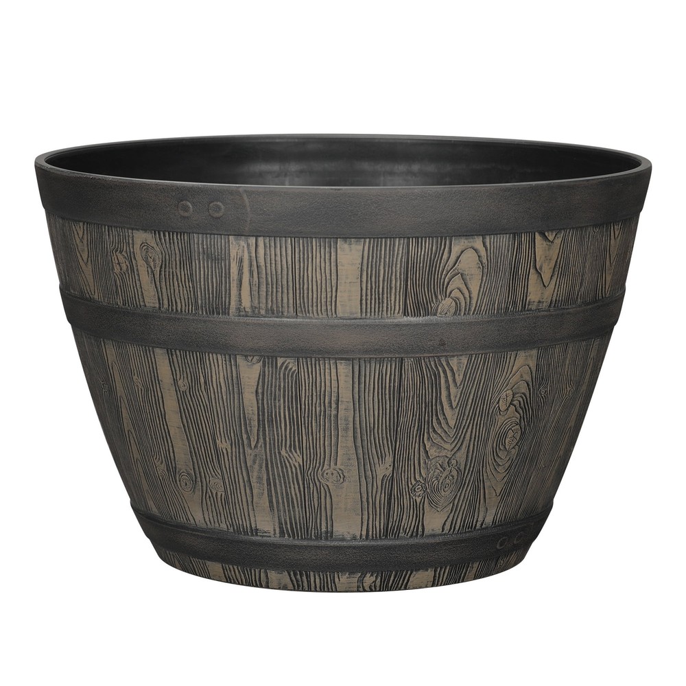 Made from durable polypropylene plastic, the Better Homes and Gardens Rustic Whiskey Barrel Planter is lightweight and UV-resistant, will not crack or color-fade over time. With its classic wood and decorative look, this pot will fit into any indoor and outdoor setting. The planter pot has been carefully designed to replicate the feeling of an aged wine cask with detailed wooden grain and metal bands which held the cask together. This gives the pot a warm and genuine feeling of wood but made with recycled plastic to give it a long-lasting life. This flowerpot has molded “easy to knock-out” drainage holes for both indoor and outdoor use. No drilling is required. This makes the water flow which can protect the roots and prevent plant stress and root disease. Pots with drainage holes are beneficial for increasing and boosting the life of a potted plant. Better Homes & Gardens 20" Whiskey Barrel Planter Made from 50% certified recycled plastic Fade, frost, and weather resistant Easy knock-out drainage holes allow excess water to empty Perfect for use indoors in a variety of rooms or outside on patios, porches, in gardens, on walkways, and more Product weight: 4lbs. Arrives fully assembled Easy to care for, simply wipe down as needed with a clean damp cloth after emptying all contents Can hold up to 11.9gallons Crafted of polypropylene resin for a long life of use almost anywhere An ideal planter for succulents, ferns, flowers, and other house plants Great for the home, in the office, and more We recommend using a protective barrier to prevent water damage to tabletops and other surfaces Dimensions: 20" Dia. x 13" Height Bottom Diameter: 12.3" Color: Brown