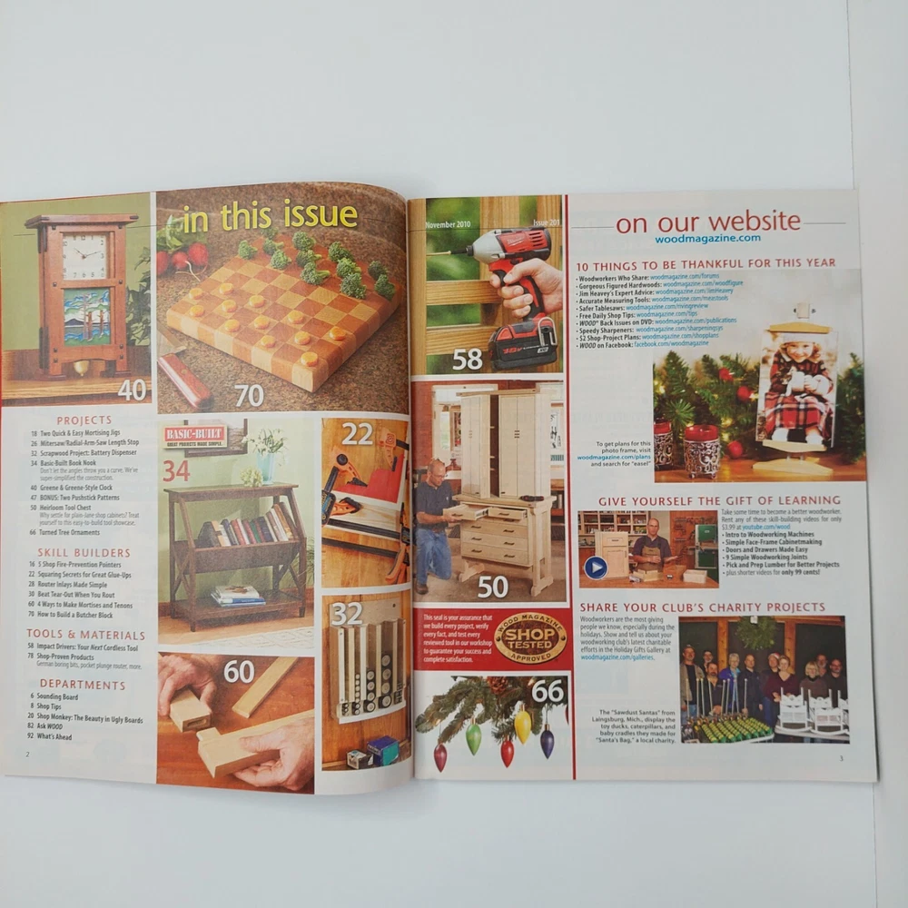 Better Homes and Gardens Wood Magazine Nov 2010 Issue 201, Oct 2011 Issue 207, & May 2017 Issue 246 . Includes the following projects: Shop Tool Chest Fold Flat Workbench Rock Solid Workbench Butcher Block Side Table Modular Shed Shaker Tables Serving Tray Two in good condition and one is new. Feel free to ask any questions! I try to respond immediately. Thank you for your interest! ~~~~~ Shipping and Refunds I will, usually, ship within one business day of receiving cleared payment. Payment refunded if buyer contacts me within 30 days from the delivery date.· I ship, primarily, with USPS, but do use other shipping services such as UPS, FedEx, etc. The buyer pays for return shipping. The item must be unused, undamaged, and in the same condition as I sent it, and you will get a refund.