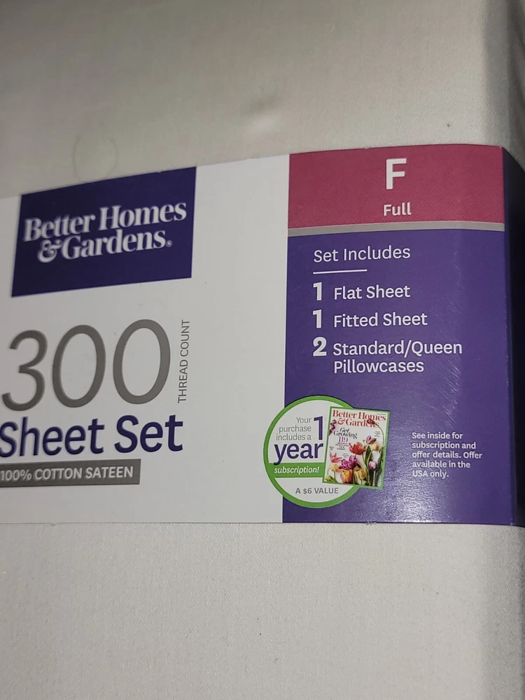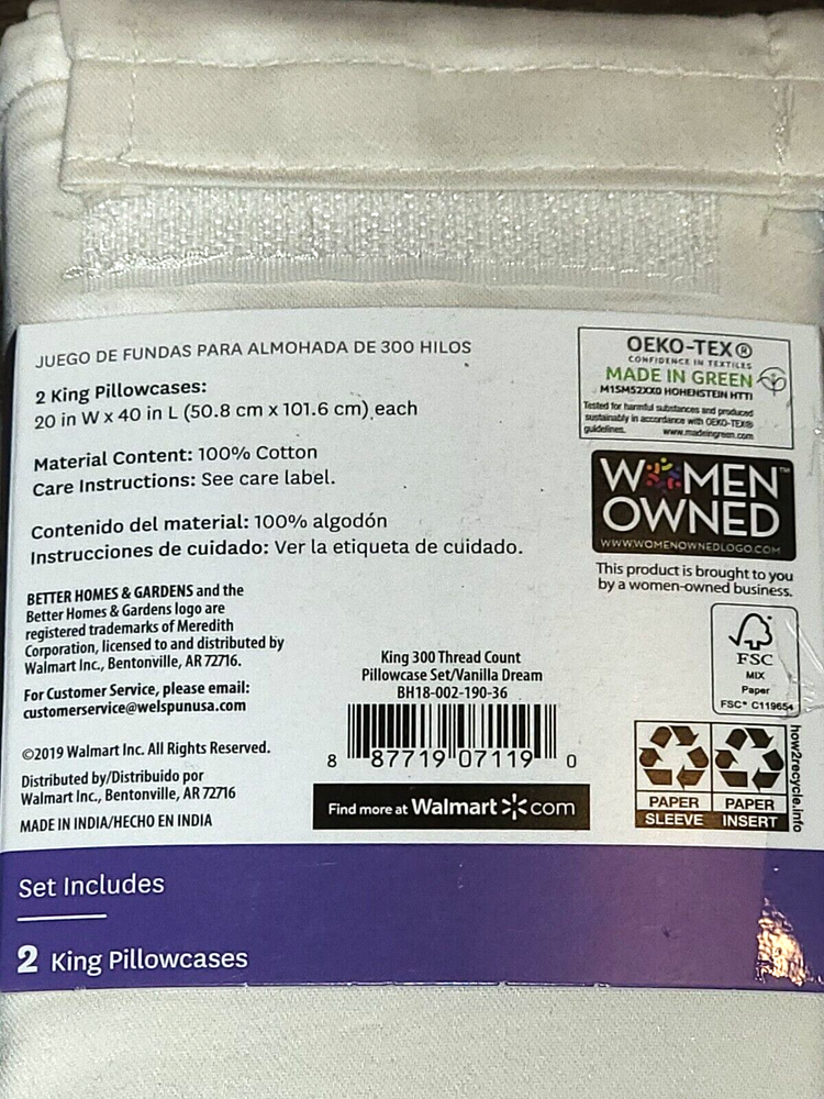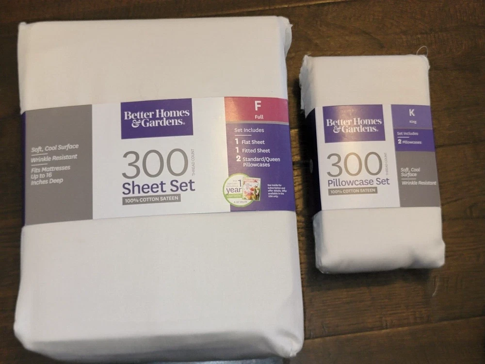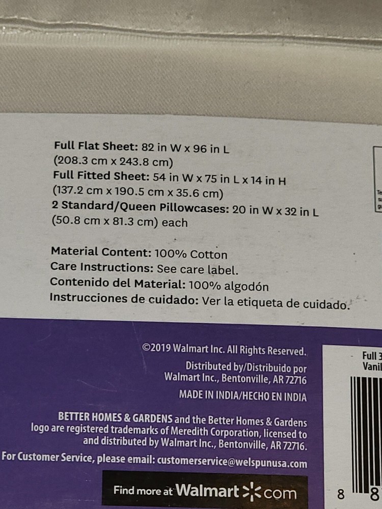 New with Tag Better Homes and Gardens Full Size Sheet Set Includes Full Size Flat Sheet, Full Size Fitted Sheet and 2 Standard/ Queen Pillowcases. Also included is a separate package containing 2 King Size Pillowcases. Color is Vanilla Dream 100 % Cotton Sateen Soft Cool Surface 300 Thread Count Thanks for looking and please let me know if you have any questions!