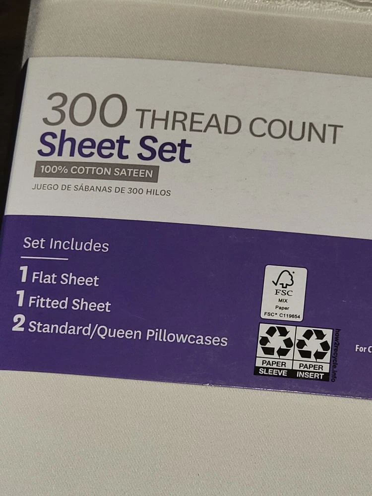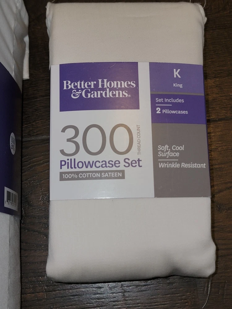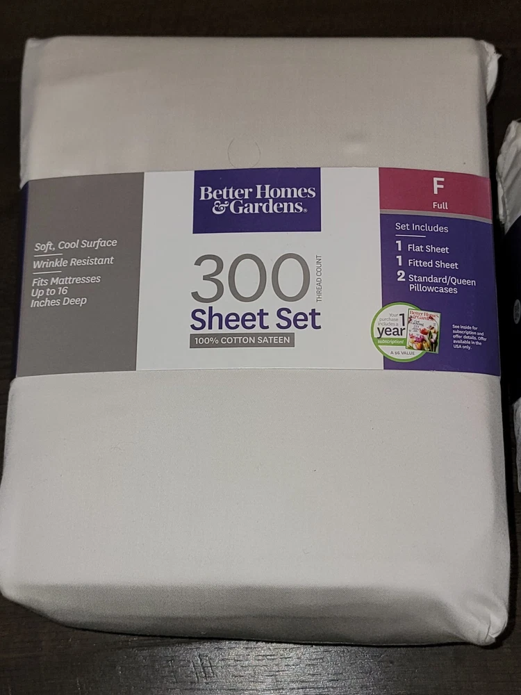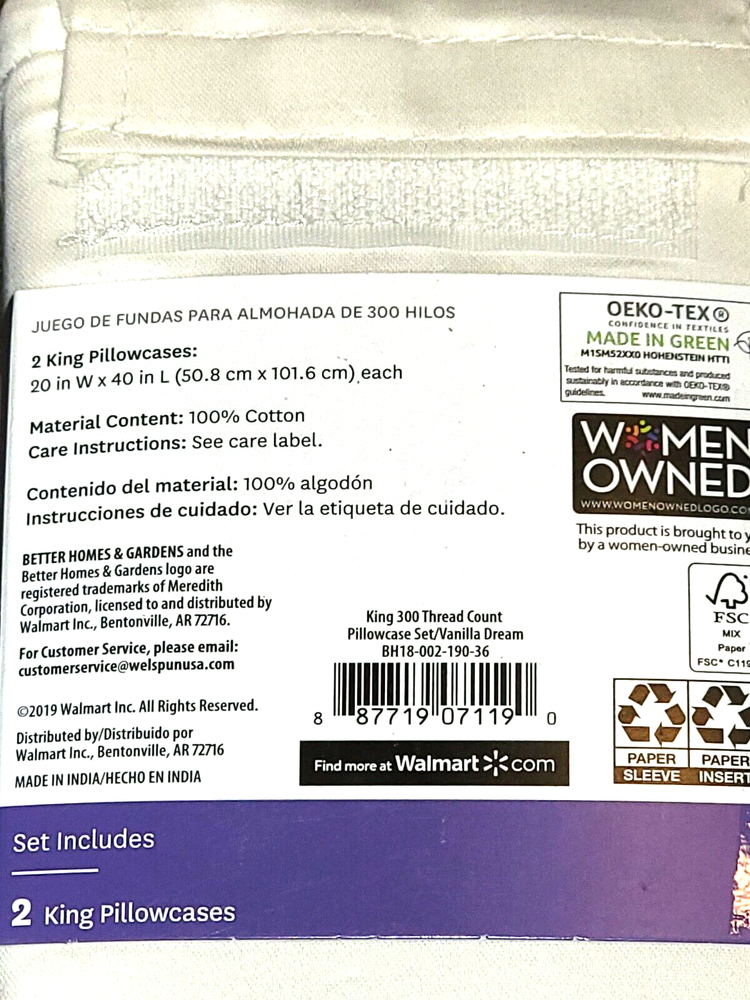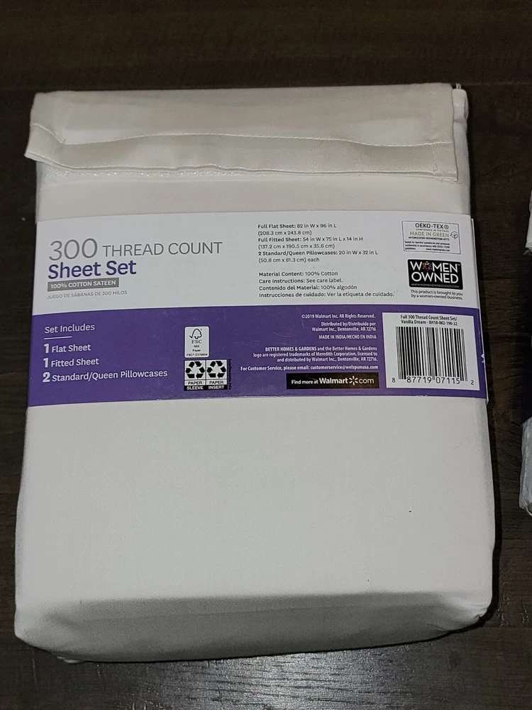 New with Tag Better Homes and Gardens Full Size Sheet Set Includes Full Size Flat Sheet, Full Size Fitted Sheet and 2 Standard/ Queen Pillowcases. Also included is a separate package containing 2 King Size Pillowcases. Color is Vanilla Dream 100 % Cotton Sateen Soft Cool Surface 300 Thread Count Thanks for looking and please let me know if you have any questions!