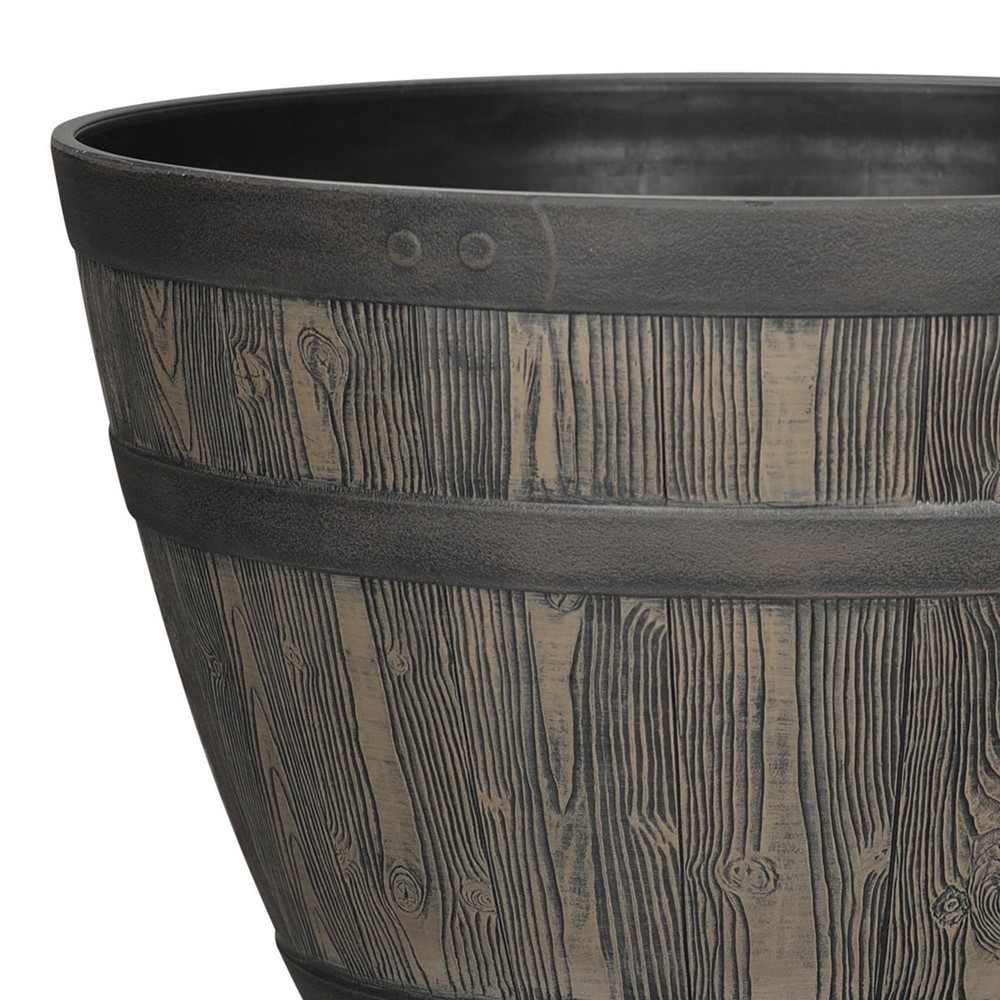 Made from durable polypropylene plastic, the Better Homes and Gardens Rustic Whiskey Barrel Planter is lightweight and UV-resistant, will not crack or color-fade over time. With its classic wood and decorative look, this pot will fit into any indoor and outdoor setting. The planter pot has been carefully designed to replicate the feeling of an aged wine cask with detailed wooden grain and metal bands which held the cask together. This gives the pot a warm and genuine feeling of wood but made with recycled plastic to give it a long-lasting life. This flowerpot has molded “easy to knock-out” drainage holes for both indoor and outdoor use. No drilling is required. This makes the water flow which can protect the roots and prevent plant stress and root disease. Pots with drainage holes are beneficial for increasing and boosting the life of a potted plant. Better Homes & Gardens 16" Rustic Whiskey Barrel Planter Made from 50% certified recycled plastic Fade, frost, and weather resistant Easy knock-out drainage holes allow excess water to drain Product weight: 2.27bs Perfect for use indoors in a variety of rooms or outside on patios, porches, in gardens, on walkways, and more Dimensions: 15.9 D x 10.3" H Bottom Diameter: 9.4"
