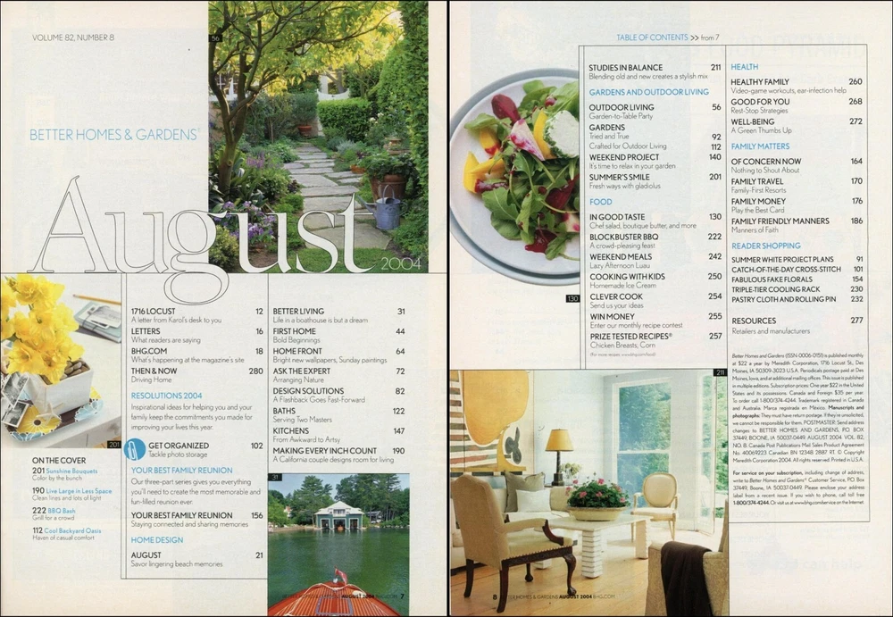 Here's a great Gift Idea! Better Homes and Gardens August, 2004 BETTER HOMES AND GARDENS magazine is one of America's oldest and most successful magazines pertaining to homemaking, cooking, and family. A typical issue is full of a variety of indoor and outdoor projects to make your home comfy and unique as well as recipes and meal planning. In addition, the magazine includes matters of family needs such as advice on finances, raising kids, and fun things to do. °°° ° °°° ° °°° ° °°° ° °°° CATEGORY: Homemaking GENRE: House, Gardening, Recipes, Parenting FEATURED ARTICLES: See contents page above. NOTABLE ADVERTISING: Toyota, Benjamin Moore, Iams, Pella, etc. SIZE: Approx. 8" X 10.5", 280 pages. CONDITION: Used, good condition, good binding, no apparent missing pages. Average cover wear and a small tear on the spine. ----- + ----- + ----- + ----- + ----- + ----- + ----- + ----- + ----- This would make a great gift! Shipping: (see SHIPPING AND PAYMENTS section below) Sales shipped to an Illinois address, please add 9.0% sales tax. Multiple purchases will be combined for the lowest possible shipping costs! Please click on ADD TO CART (not BUY IT NOW) when making multiple purchases. And you're welcome to add us to your favorites list ! THANK YOU!