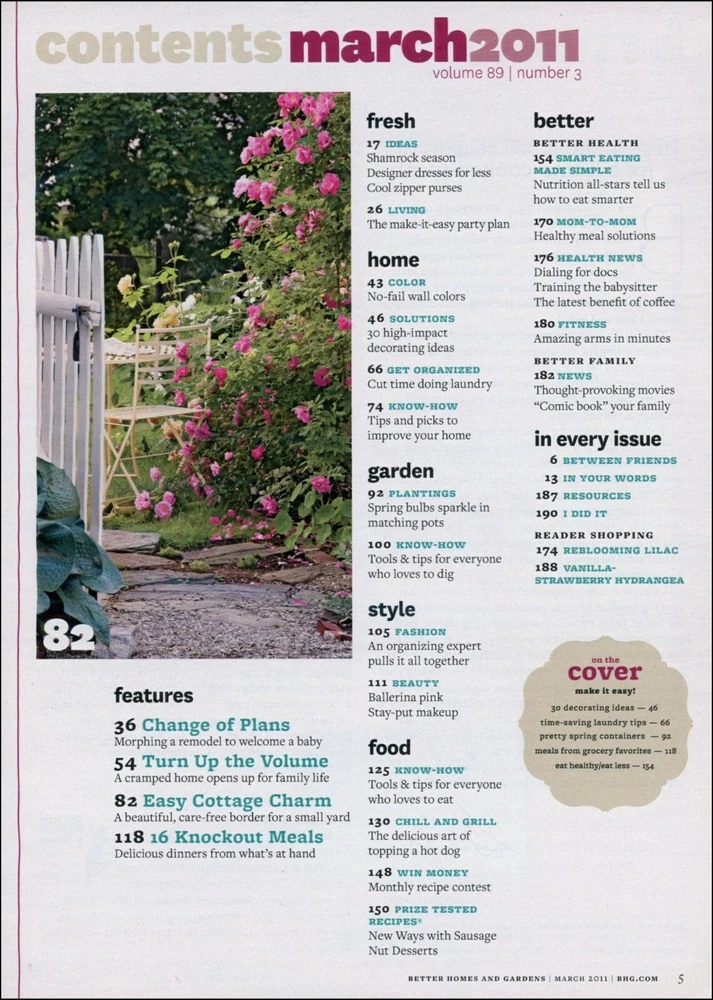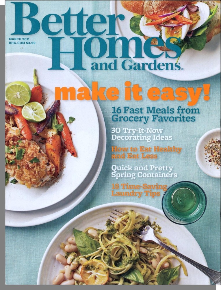 Here's a great Gift Idea! Better Homes and Gardens March, 2011 BETTER HOMES AND GARDENS magazine is one of America's oldest and most successful magazines pertaining to homemaking, cooking, and family. A typical issue is full of a variety of indoor and outdoor projects to make your home comfy and unique as well as recipes and meal planning. In addition, the magazine includes matters of family needs such as advice on finances, raising kids, and fun things to do. °°° ° °°° ° °°° ° °°° ° °°° CATEGORY: Homemaking GENRE: House, Gardening, Recipes, Parenting FEATURED ARTICLES: See contents page above. Recipes, too! NOTABLE ADVERTISING: Cottonelle, Pringles, Coldwater Creek, etc. SIZE: Approx. 8" X 10.5", 190 pages. CONDITION: Used, overall good condition, good binding, no apparent missing pages. Slight cover wear, corner creases on the first 3 dozen pages. Small tear on the back cover and last page. ----- + ----- + ----- + ----- + ----- + ----- + ----- + ----- + ----- This would make a great gift! Shipping: (see SHIPPING AND PAYMENTS section below) Sales shipped to an Illinois address, please add 9.0% sales tax. Multiple purchases will be combined for the lowest possible shipping costs! Please click on ADD TO CART (not BUY IT NOW) when making multiple purchases. And you're welcome to add us to your favorites list ! THANK YOU!