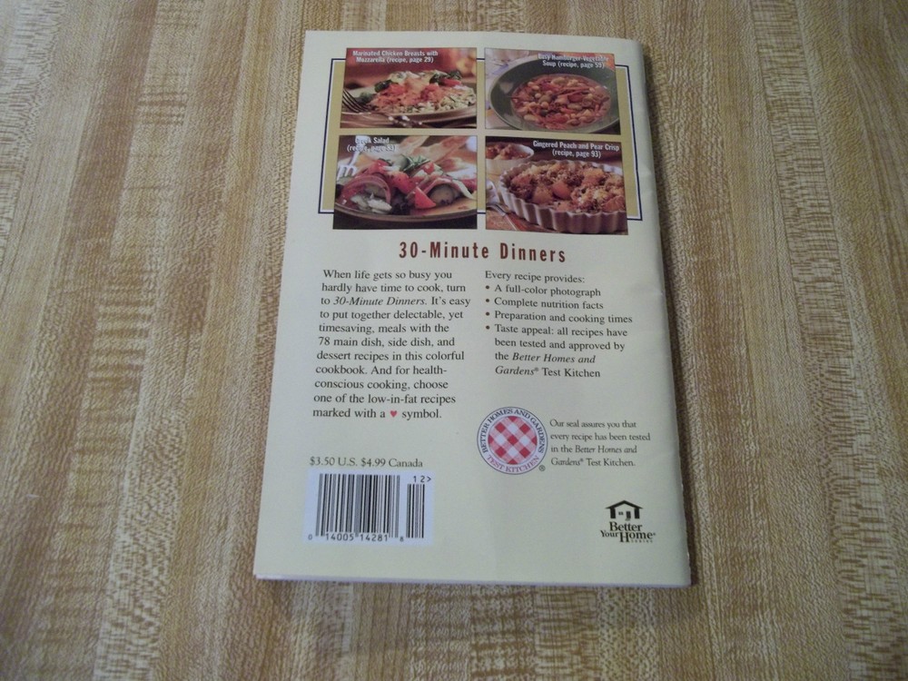 Better Homes and Gardens, 30-Minute Dinners, 78 family favorite recipes, excerpt from Better Homes and Gardens Big Book of 30-Minute Dinners, copyright 2001. The pages and the cover of this book are in very good condition. The last page and inside the back cover has a phone number written on it, otherwise the pages are clean. Recipes include: Florentine Pizza, Pork Diane, Herbed Steak, Curried Chicken Salad, Shrimp and Plum Tomatoes with Pasta and many more. Please note that we ebay only as a hobby. We search for items that are unique or useful and try to price them to be affordable. Please check out our other items, as we will gladly combine shipping.