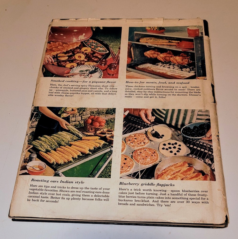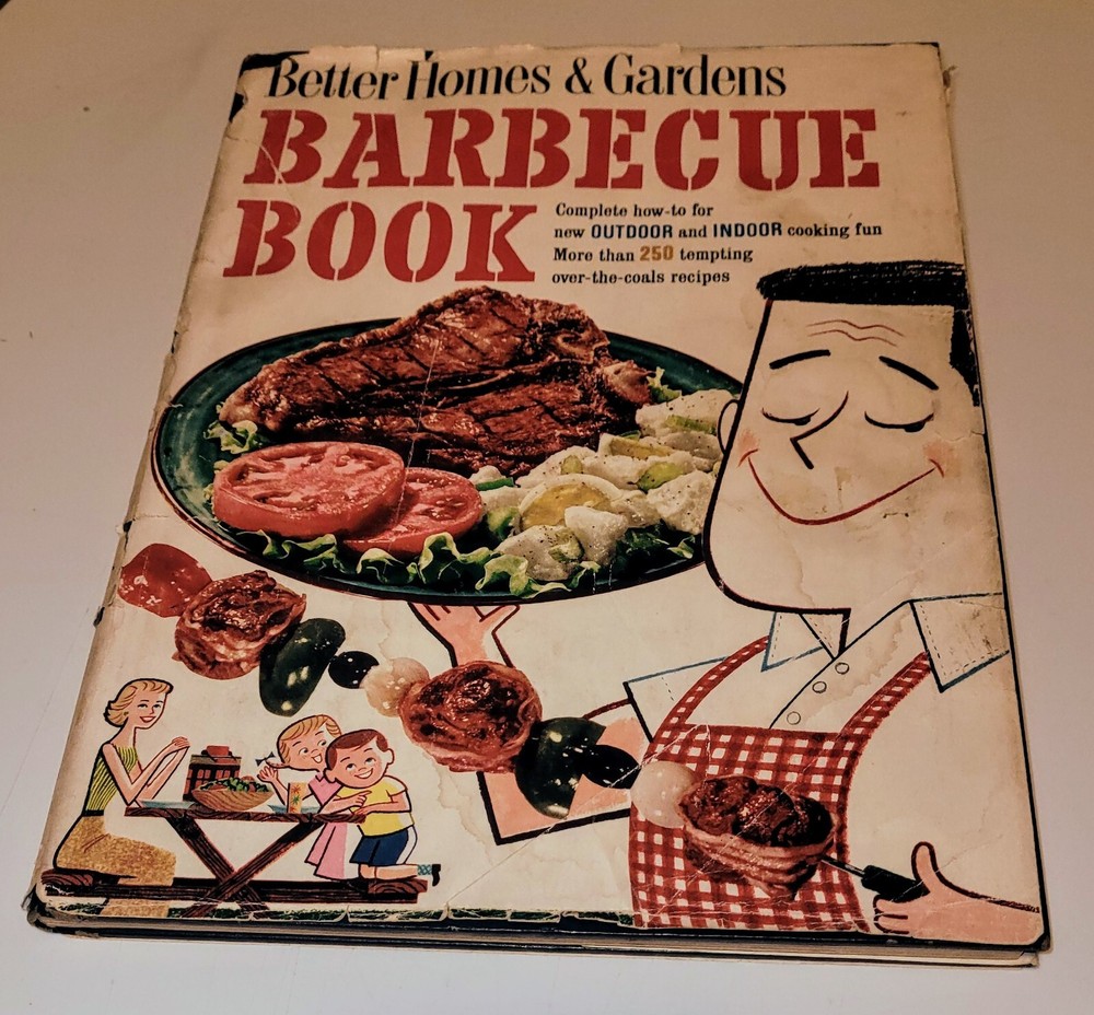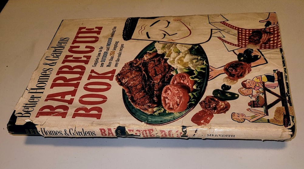 A mid-50s vintage Better Homes and Gardens Barbecue book found in the attic. The information is essential, the recipes are fantastic, and the photos are priceless. Hardcover with dustjacket that has some wear. Hundreds of recipes from somewhere back in time compiled in 162 pages.