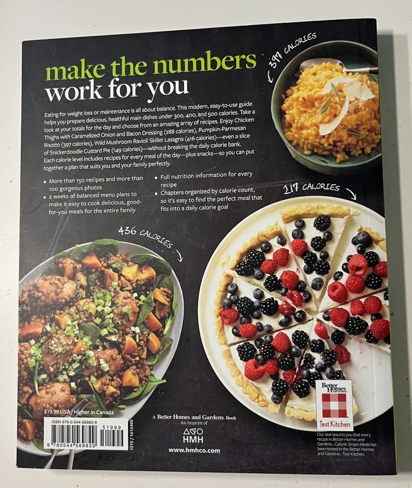 | Book Title | Better Homes and Gardens Calorie-Smart Meals : 150 Recipes for Delicious 300-, 400-, and 500-Calorie Dishes |
