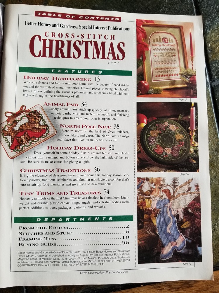 This magazine was published by the Meridith Corporation, copyright 1995. It is in excellent, unused condition. This is the Christmas issue edited by Better Homes & Gardens each year. This is for Christmas 1994 and includes 40 Dazzling projects. I will combine shipping for multiple purchases. For multiple purchases, use the shopping cart to group your purchases and wait for an invoice from me. I do not accept returns or give refunds so please ask questions before you bid. I will leave feedback after I know the item has arrived at its destination. I will ship only to your confirmed address. Thank you for shopping with me.