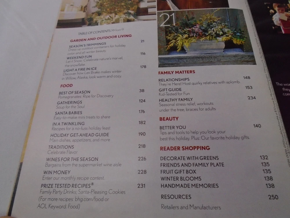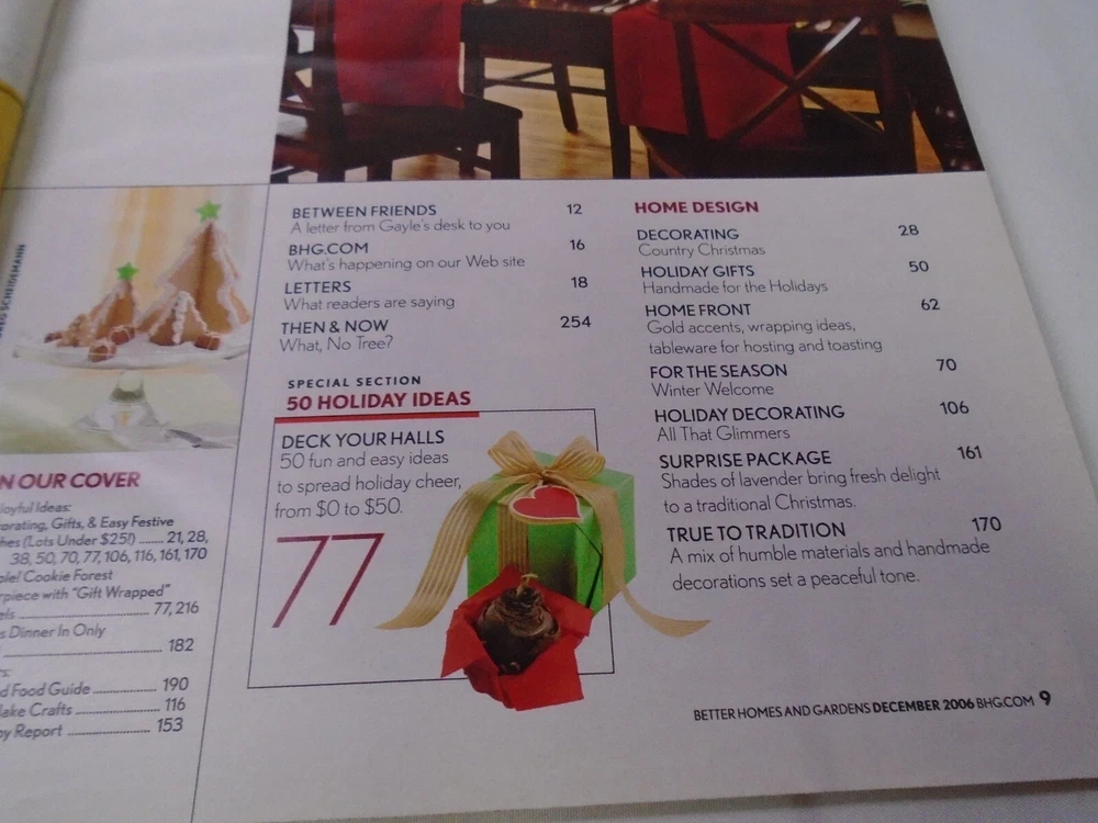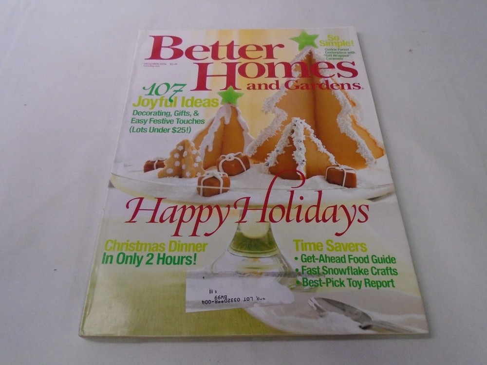 Better Homes and Gardens December 2006 Happy Holidays Magazine is clean with minimal wear. No tears, no water damage, and no musty or smoky odors. Please see photo of contents in this issue. Comes from a smoke free home. Fast shipping after purchase. Thank you for looking at this item. I combine shipping for multiple purchases. Reasonable offers are always considered. Feel free to send me a message at any time.