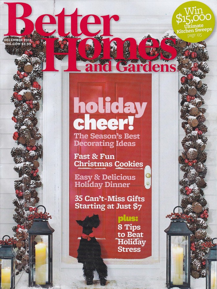 BETTER HOMES AND GARDENS Better Homes and Gardens is the fourth best-selling magazine in the United States . Better Homes and Gardens focuses on interests regarding homes, cooking , gardening , crafts , healthy living, decorating , and entertaining. The magazine is published 12 times per year by the Meredith Corporation . It was founded in 1922 by Edwin Meredith , who had previously been the United States Secretary of Agriculture under Woodrow Wilson . Better Homes and Gardens is one of the " Seven Sisters ", a group of women's service magazines. DECEMBER 2011 Holiday Cheer ! The Holiday Season Issue The Season’s best decorating ideas Fast & Fun Christmas Cookies Easy & Delicious Holiday Dinner 35 Can’t-Miss Gifts Starting at just $7 8 Tips to Beat Holiday Stress Plus the typical articles and columns on style, food, organizing, cleaning, gardening, health and nutrition, appearance, home, family, self help, celebrity tips and comments, and much much more Cover clean, no markings; cover does crease on left side with a rip down to the bottom left corner; otherwise binding firm; pages clean, no markings, creases, or rips. ** USED – VERY GOOD – REALLY GOOD CONDITION ** Click Here to check out our many other Magazine Back-issues I do my best to describe my items. Am willing to answer any questions to the best of my ability. Willing to combine shipping with other purchases. Please submit invoice revision request. Please make sure Ebay and PayPal correctly reflect your current shipping address. Seller not responsible for returned shipments. In cases of returned packages, buyer will be reimbursed for cost of item, minus shipping fee. Click Here to Check Out Our Entire Store