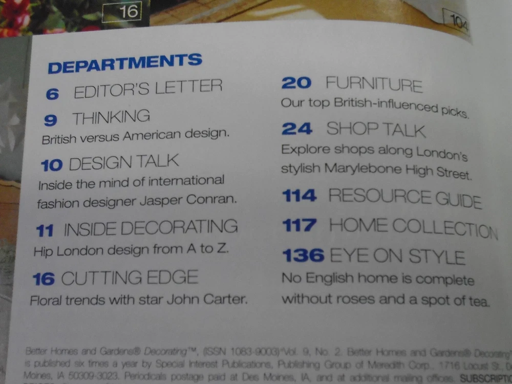 Better Homes and Gardens Decorating Magazine March/April 2004 English Style Magazine is clean with minimal wear. No tears, no water damage, and no musty or smoky odors. Please see photo of contents in this issue. Comes from a smoke free home. Fast shipping after purchase. Thank you for looking at this item. I combine shipping for multiple purchases. Reasonable offers are always considered. Feel free to send me a message at any time.
