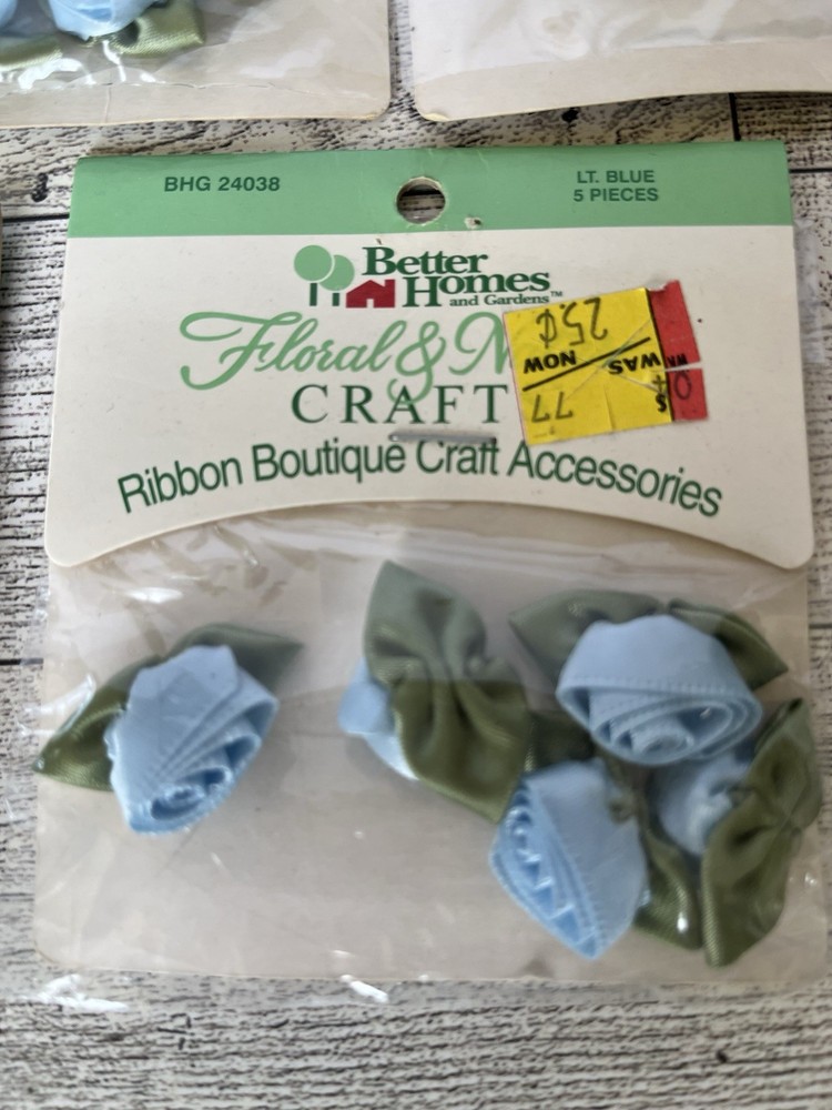 Up for sale are these Better Homes and Gardens Floral & Nature Ribbon Boutique Flowers Lt Blue 5 Packs/ 5 pieces in each. New in package. Please let me know if you have any questions. Thanks for looking!