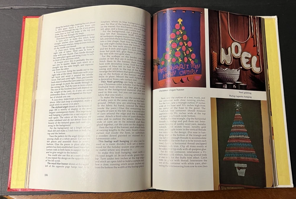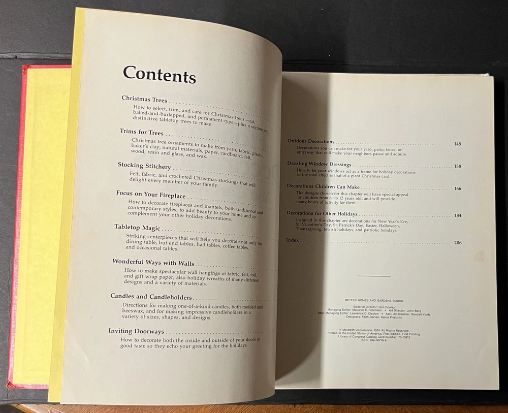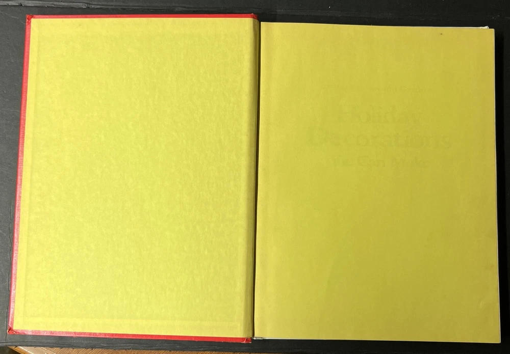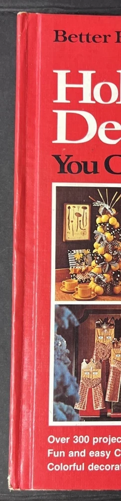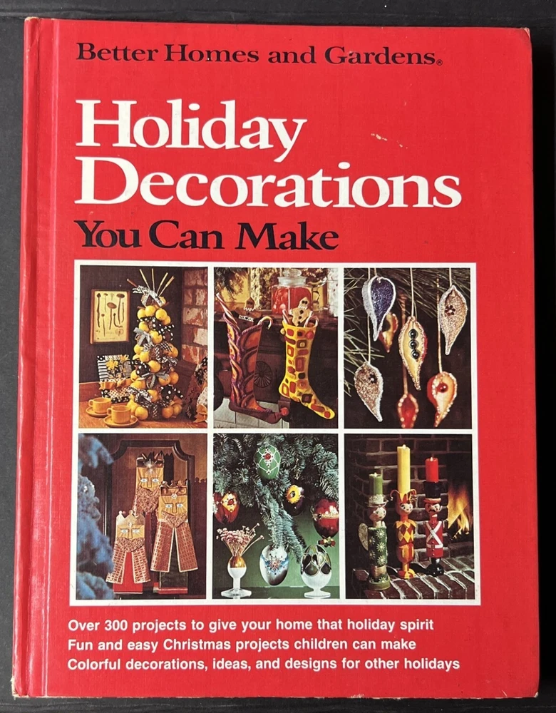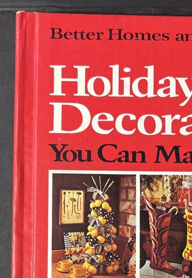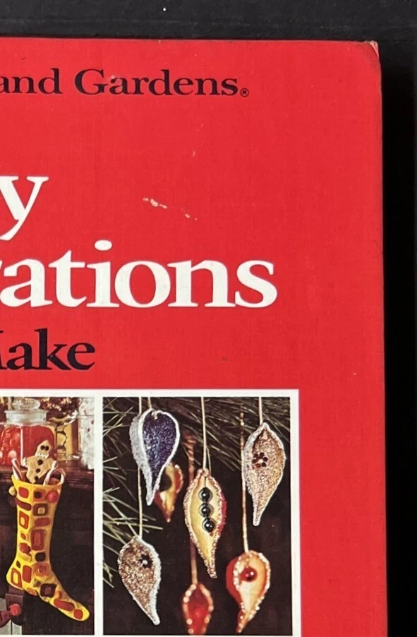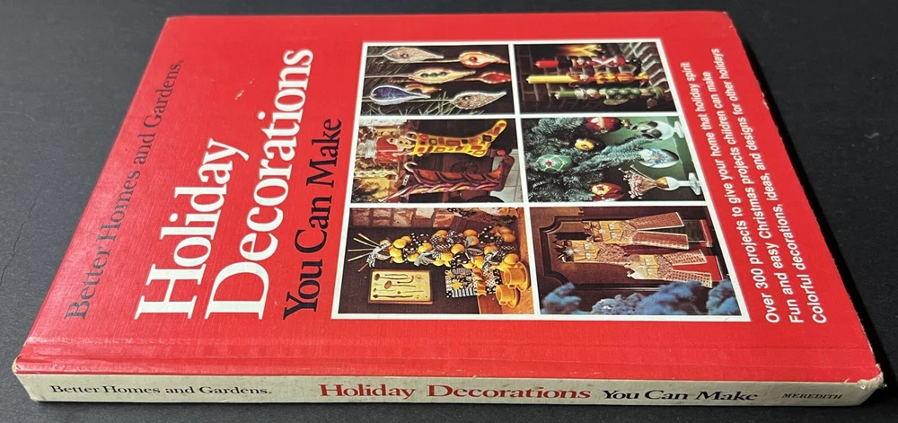 Better Homes and Gardens Holiday Decorations You Can Make Hardcover (1974, Meredith Corporation) - Before you know it Christmas will be here; start early by buying this book and unleash your creative spirit. This book is in very good, not perfect, condition. The cover, which has retained rich coloring, and all pages, which are off-white to cream-colored, are firmly attached. The front and back covers have wear and rounding at all corners, the top and bottom left- and bottom right-hand corners have color/paper loss, the top right-hand corner has an approx. 1/4" stain, there is some color loss above "ons" in "Decorations", the bottom edge has color loss; the back cover could probably use a little cleaning, there are smudges and/or fingerprints in various places, the bottom right-hand corner has color/paper loss. Additional scans and/or details can be provided if needed. Shipped by USPS Media Mail.