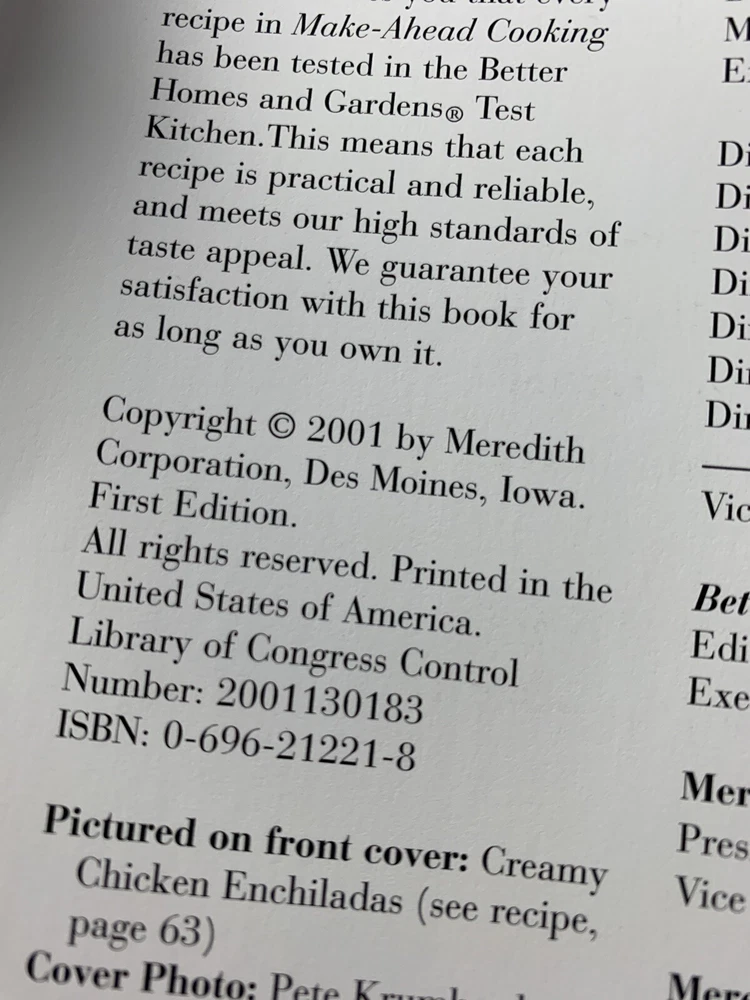 Better Homes Gardens Make-Ahead Cooking First Edition 2001