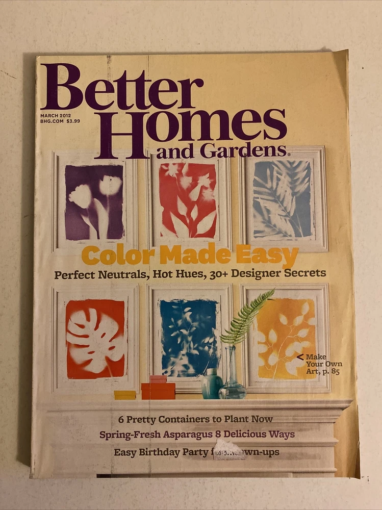 Better Homes and Gardens Magazine 2012 March - Color Made Easy - Your Own Art. Condition is Very Good. Shipped with Economy Shipping.