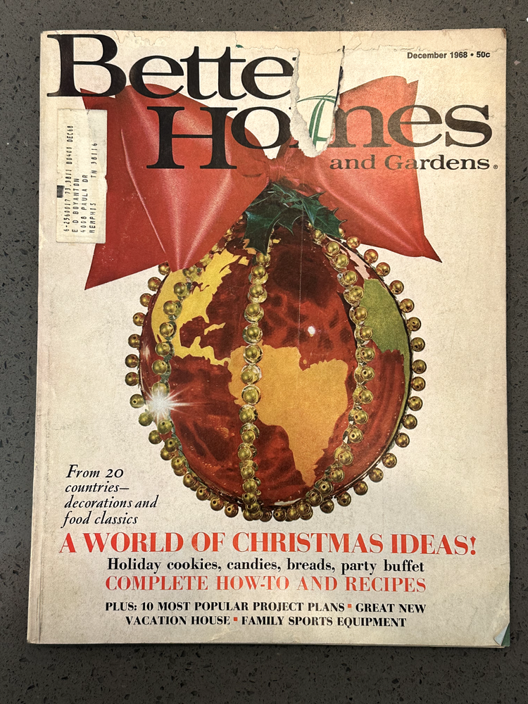 December 1968 issue of "Better Homes & Gardens" magazine, focusing on holiday-themed content. Christmas recipes from 20 countries around the world included, along with decoration ideas. Magazine has aged wear and tear. Photos: 1 - Front Cover, 2 - Back Cover