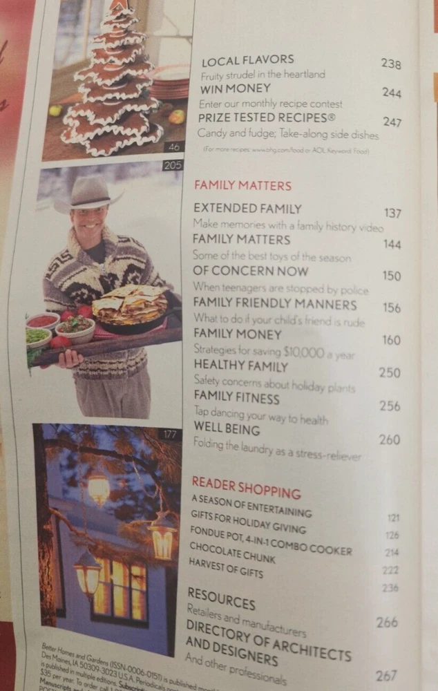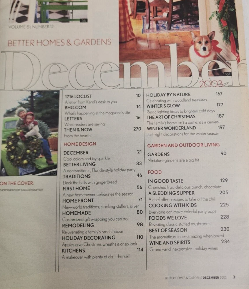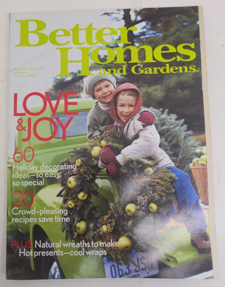 Better Homes and Gardens Magazine December 2003 Love & Joy Magazine is clean with minimal wear. No tears, no water damage, and no musty or smoky odors. Please see photo of contents in this issue. Comes from a smoke free home. Fast shipping after purchase. Thank you for looking at this item. I combine shipping for multiple purchases. Reasonable offers are always considered. Feel free to send me a message at any time.