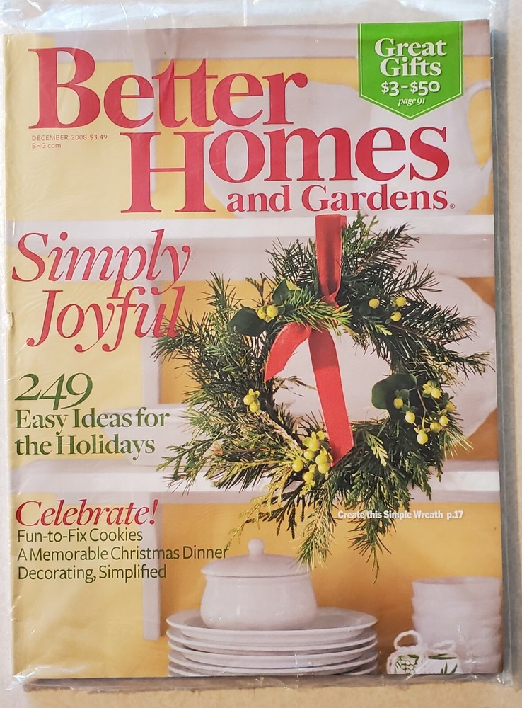Better Homes and Gardens Magazine December 2008 Simply Joyful 249 Easy ideas for the holidays! Celebrate! Fun-to-fix Cookies! A memorable Christmas dinner Decorating, Simplified! Publisher: Meredith Brand New Ideas for Holidays! Still in original plastic. Top area was cut open to remove private insert. Magazine has never left plastic. New! Thanks for looking!