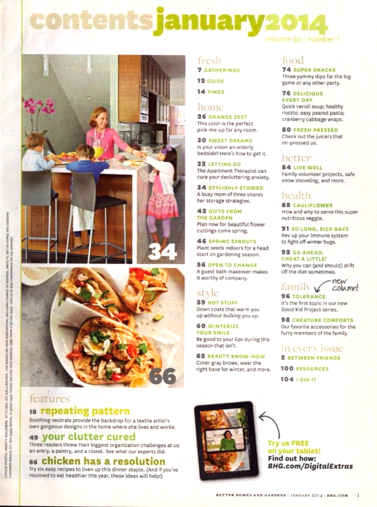 Better Homes and Gardens Magazine January 2014 Some of this issue's special features include: Smart Storage Solutions Pretty Citrus Hues to Refresh Any Room New Takes on Chicken Shipping and handling is $6.95 USA only. International shipping costs will be calculated by location. A shipping discount will apply on multiple purchases when combined on a single invoice. When purchasing more than one item, please request total from seller to ensure combined shipping discount. Be sure to visit Two Pink Flamingos' Store and add us to your Favorites List! Questions? Feel free to email twopinkflamingos by sending message through eBay.