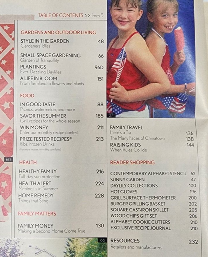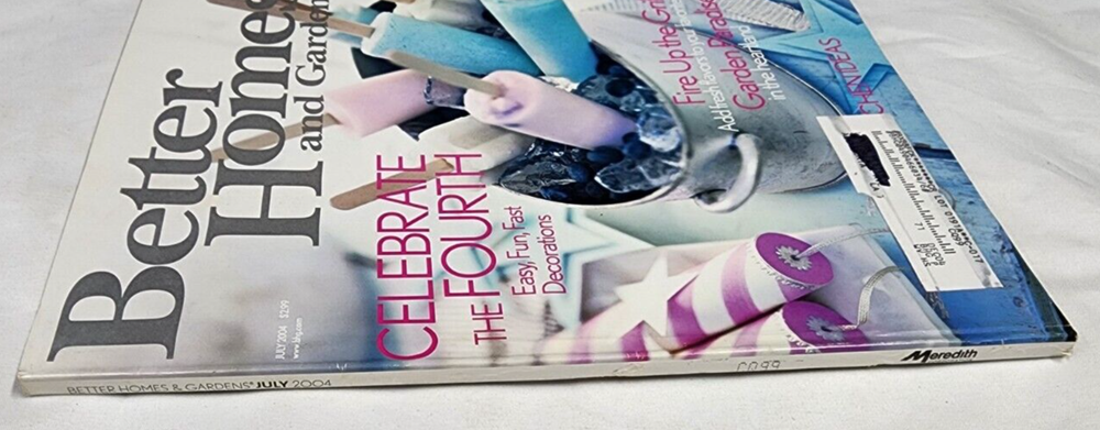 Better Homes and Gardens Magazine July 2004 Celebrate the Fourth Magazine is in very good condition. Has a couple of tears on the back cover. Please see photo of contents in this issue. Comes from a smoke free home. Fast shipping after purchase. Thank you for looking at this item. I combine shipping for multiple purchases. Reasonable offers are always considered. Feel free to send me a message at any time.