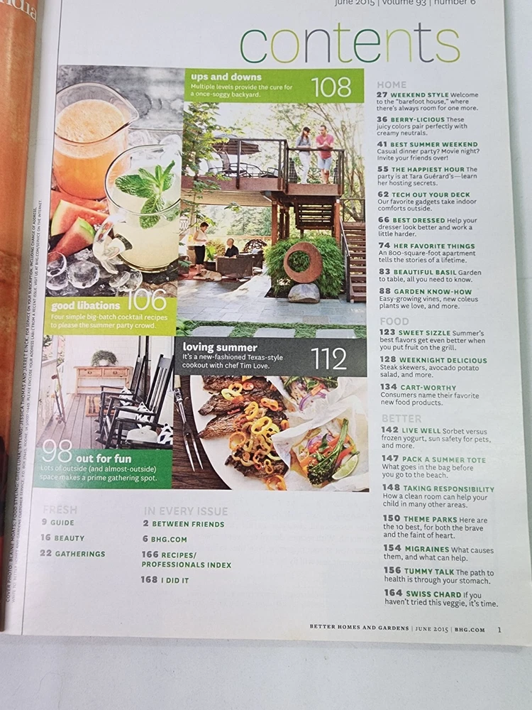 Better Homes and Gardens Magazine June 2015 Cool Summer Fun Magazine is clean with minimal wear. No tears, no water damage, and no musty or smoky odors. Please see photo of contents in this issue. Comes from a smoke free home. Fast shipping after purchase. Thank you for looking at this item. I combine shipping for multiple purchases. Reasonable offers are always considered. Feel free to send me a message at any time.