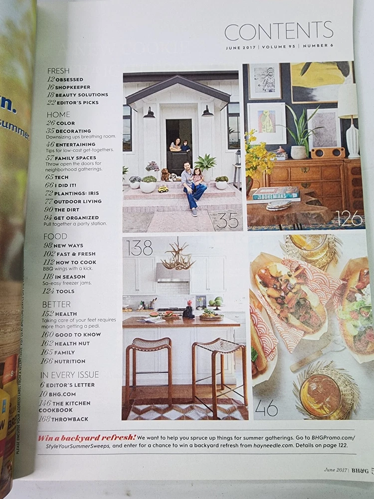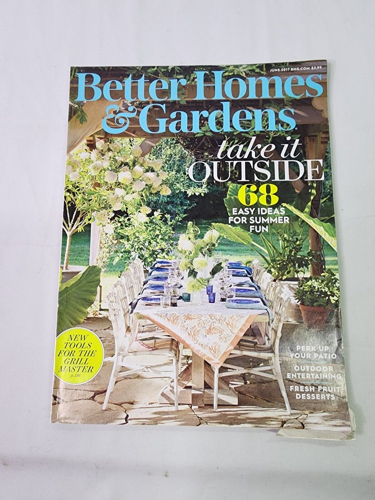 Better Homes and Gardens Magazine June 2017 Take It Outside Magazine is clean with minimal wear. No tears, no water damage, and no musty or smoky odors. Please see photo of contents in this issue. Comes from a smoke free home. Fast shipping after purchase. Thank you for looking at this item. I combine shipping for multiple purchases. Reasonable offers are always considered. Feel free to send me a message at any time.