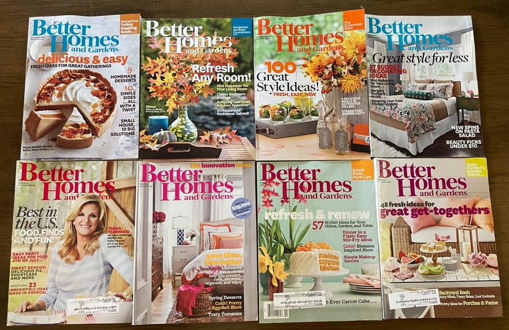 8 issues of Better Homes and Gardens Magazine , all from year 2013: April, May, June, July, August, September, October, and November. All magazines in good condition. Magazines have been stored in a dry, indoor, smoke-free environment.