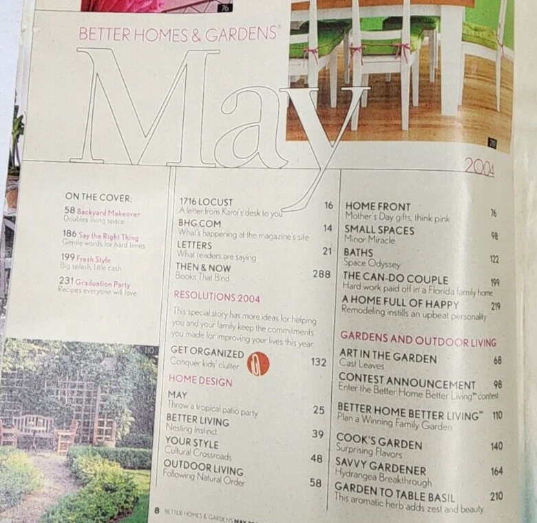 Better Homes and Gardens Magazine May 2004 Fresh Style Magazine is in very good condition with minimal wear. Please see photo of contents in this issue. Comes from a smoke free home. Fast shipping after purchase. Thank you for looking at this item. I combine shipping for multiple purchases. Reasonable offers are always considered. Feel free to send me a message at any time.