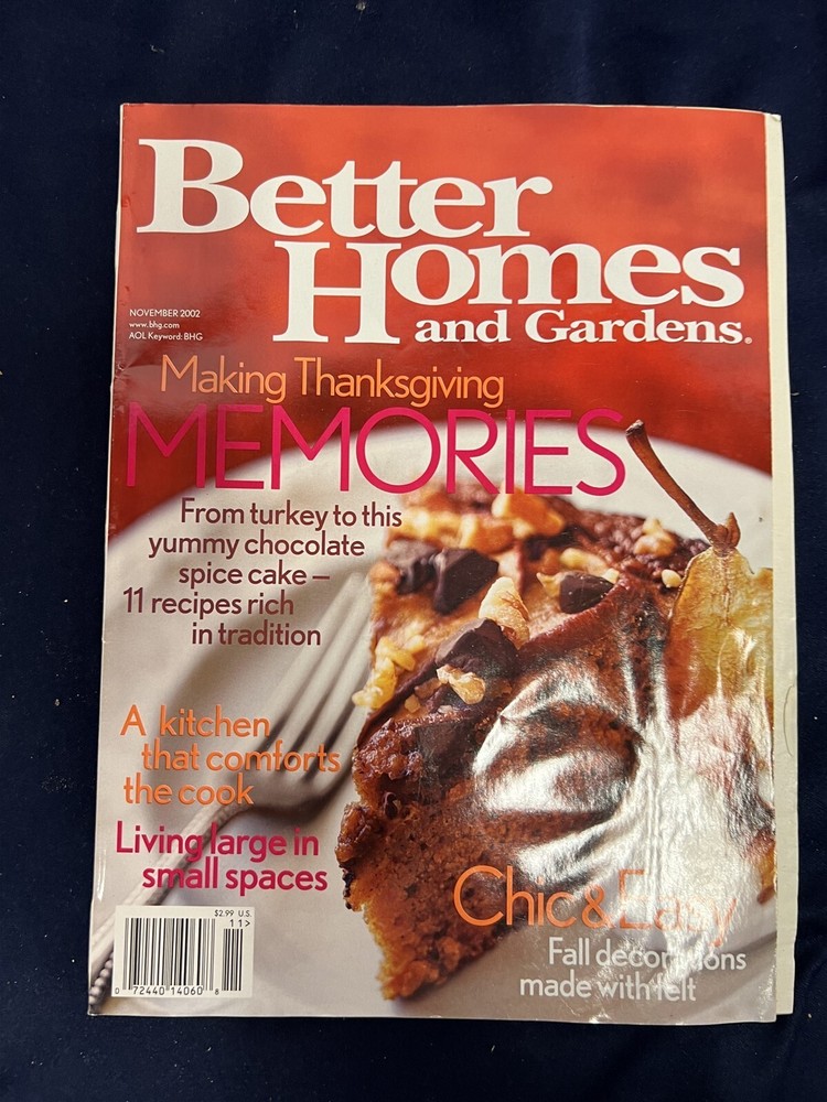 Better Homes and Gardens Magazine November, 2002. It is in very good condition. We combine shipping whenever possible. Please email us to request shipping quote for multiple item purchases before buying. Local Pick-up available please email a request prior to purchase. Powered by SixBit's eCommerce Solution