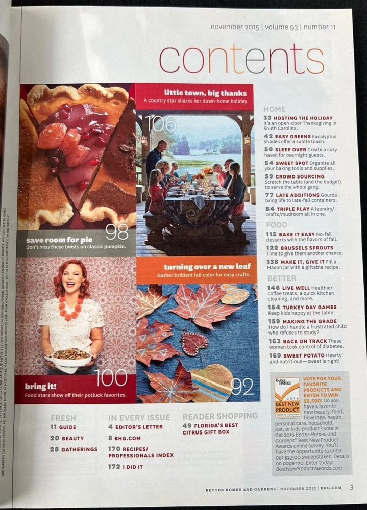 Better Homes and Gardens Magazine - November 2015 - Fall Flavors, Family Traditions at the Table. Magazine is clean and complete. Please see pictures for contents.