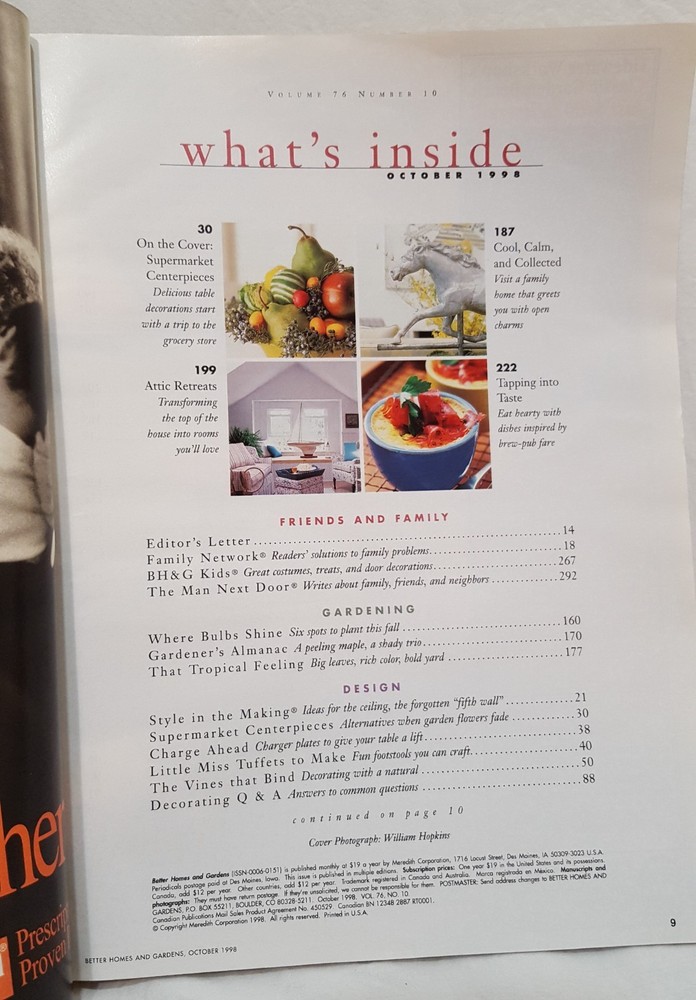 Bulbs to plant now for the showiest spring ever Brand: Better Homes and Gardens Item: Magazine Theme : How to store everything 10 space-saving tips Home favorites 14 hearty recipes with big, robust taste So-easy centerpieces from the supermarket From dusty attic to comfy retreat and more. Year: October 1998 Condition: Wear to both covers, edges and spine. Label damage on the front cover and bends on some corners of cover and pages. International Shipping - Buyer pays full shipping charges, tariffs, duties, fees, etc...